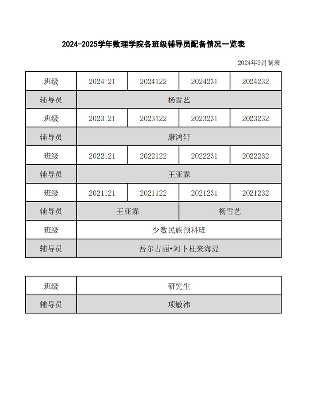 2024-2025学年1929cc威尼斯各班级辅导员配备情况一览表