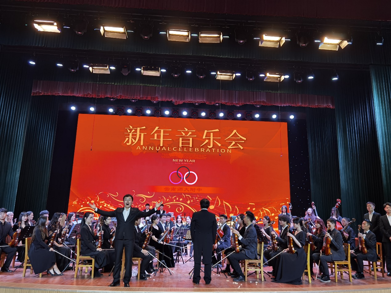 本次“高雅艺术进校园”不仅是金年会jinnianhuicom为云南师范大学附属中学奉献的一场新年音乐会,更是一场别具风格的音乐之旅。音乐会由师向宁教授为师附师生进行导赏,并对其介绍了管弦乐团的乐器组成、主要乐器的音色特点、表现特征等,引导师生欣赏贝多芬《第五交响曲》《乔家大院》等中西经典乐队及声乐作品。演出由管弦系主任周力副教授指挥,金年会jinnianhuicom艾然副教授、曹智武、张双双、张菲菲和闫润辉担任独奏或独唱。