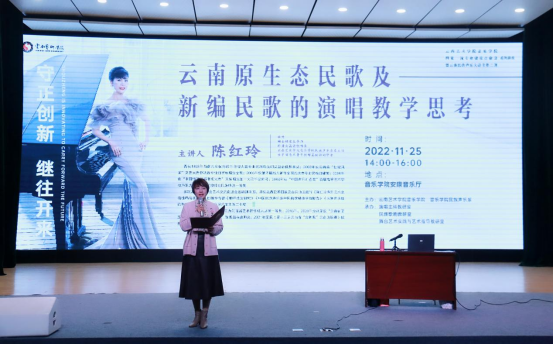 2022年11月25日下午,国家一流专业建设点建设系列讲座暨云南民族声乐大讲堂第二期“守正创新 继往开来”——云南原生态民歌及新编民歌的演唱教学思考在金年会诚信信誉至上安康音乐厅开讲。本次讲座由金年会jinnianhuicom院长林林教授主持,金年会jinnianhuicom民族声乐系系主任陈红玲教授主讲。讲座采用线上线下的同步观看方式,引起业内的高度关注与好评。