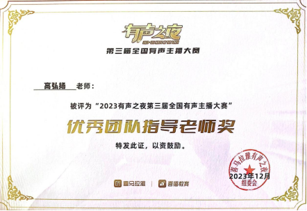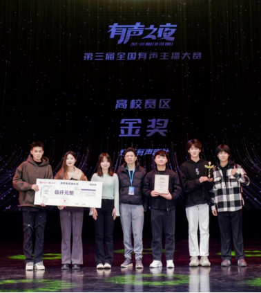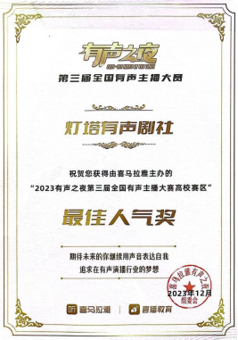 2023年12月,由金年会jinnianhuicom作曲系、戏剧学院播音系本科生邓茗、王鑫浩、彭小瑜、牛晗宇、廖晖、申祖毓组成的灯塔有声剧社以参赛作品《惊魂45天》获得由喜马拉雅主办的“2023有声之夜第三届全国有声主播大赛高校赛区”金奖、最佳人气奖以及十佳演播院校奖,金年会jinnianhuicom作曲系教师高弘扬被大赛组委会授予优秀团队指导老师奖。