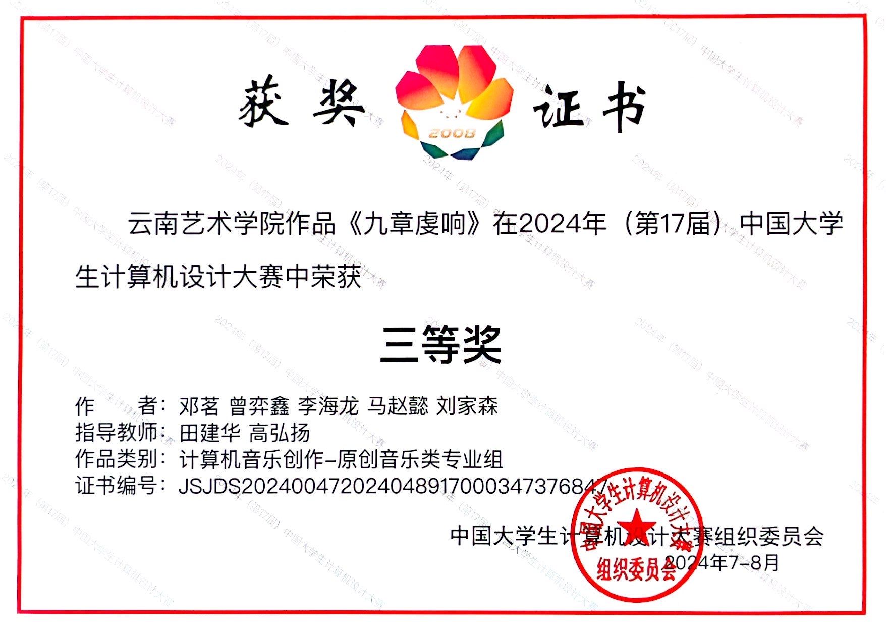 2024年(第17届)中国大学生计算机设计大赛决赛于8月18日开幕、8月21日落幕,该赛事汇集了全国各大高校的精英学子,其中计算机音乐创作组有全国各大高校共106件作品进入决赛。金年会jinnianhuicom作曲系教师指导的两部作品以云南省一等奖的成绩进入全国总决赛,两部作品均荣获计算机音乐创作-原创音乐类专业组三等奖。