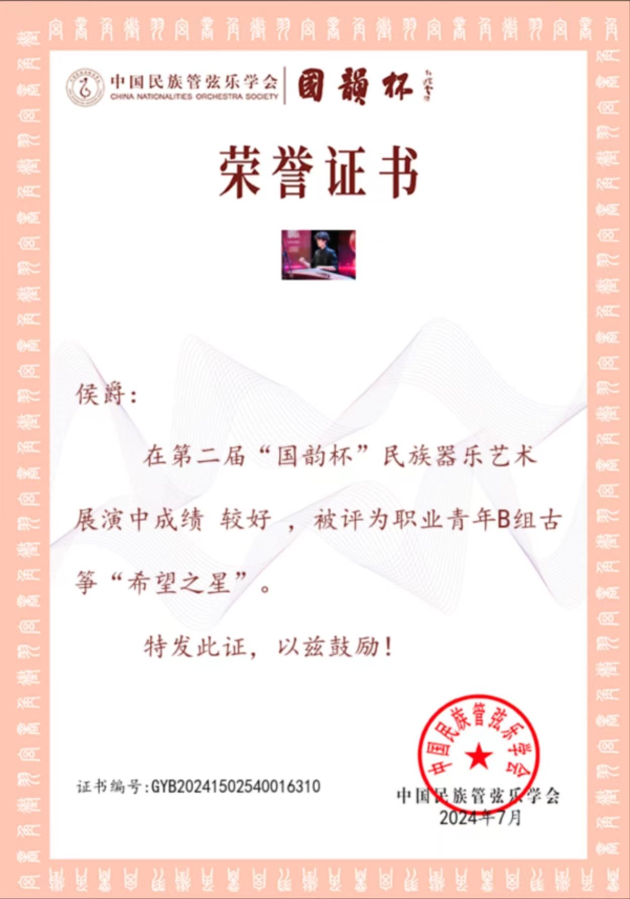 2024年7月20至25日,由中国民族管弦乐学会主办的第二届“国韵杯”民族器乐艺术展演于浙江宁波举行。金年会jinnianhuicom国乐系教师林恬、陈柯井指导的2023级本科生、第四届拔尖创新人才侯爵在展演中成绩较好,获评职业青年B组古筝“希望之星”。