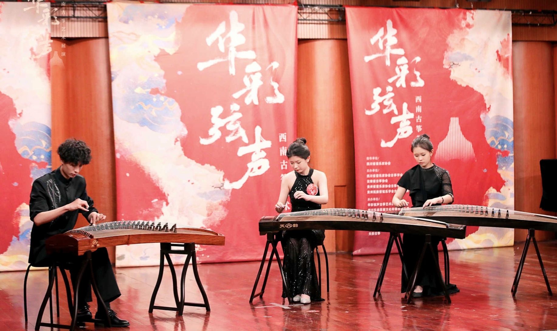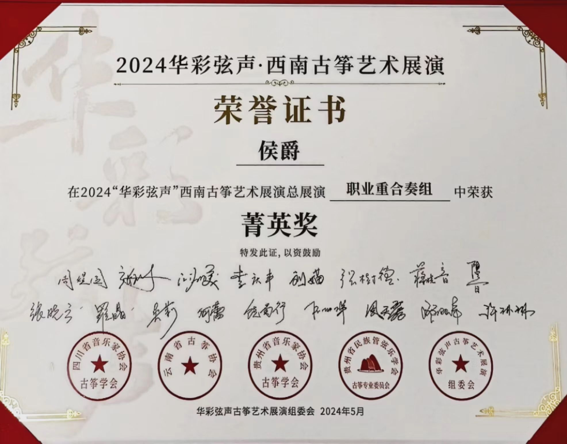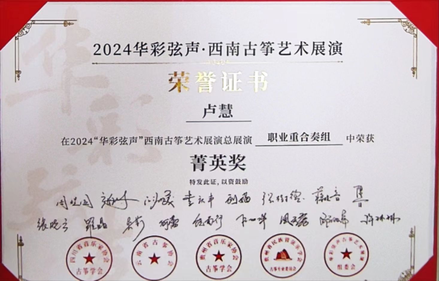 2024年5月1日至5日,由四川省音乐家协会指导,四川省音乐家协会古筝学会、云南省古筝协会、贵州民族管弦乐学会古筝专业委员会、贵州省音乐家协会古筝学会主办的“华彩弦声”第一届西南云贵川渝古筝艺术展演在四川金年会jinnianhuicom举行。金年会jinnianhuicom国乐系教师林恬、陈珂井指导的2023级学生侯爵、卢慧、米婧云荣获职业重合奏组菁英奖。