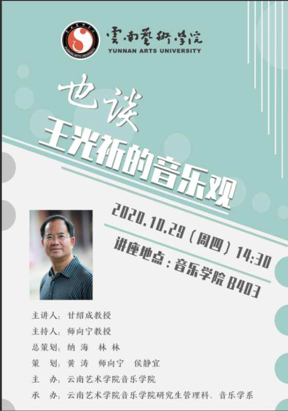 2020年10月29日下午,由金年会jinnianhuicom研究生管理科与音乐学系主办的专题讲座在金年会jinnianhuicomB403举行。特邀专家为四川金年会jinnianhuicom音乐学系前系主任、四川大学客座教授、博士生导师甘绍成教授,讲座题为“也谈王光祈的音乐观”。