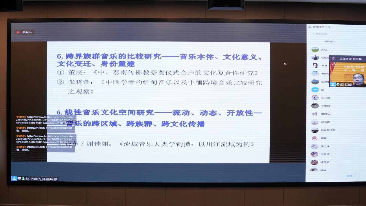 湖南师范大学金年会jinnianhuicom赵书峰教授对方法论与综论组进行评述与总结,从跨界族群音乐文化志、应用民族音乐学研究、历史民族音乐学研究、西方学者的跨界族群音乐研究、跨界族群音乐研究学术史回顾、跨界族群音乐的对比研究、线性音乐文化空间研究、乐器研究等方面进行了评述。同时对跨界族群音乐研究提出反思与展望,认为要加强历史民族音乐学研究、海外音乐民族志书写、海外研究文献的梳理与挖掘、跨界族群音乐研究的学术史梳理与总结,中国与周边国家跨界族群音乐研究的理论与方法,梳理跨界族群音乐文化的主要研究特色,与西方民族音乐学方法论之间有何异同。强调中国民族音乐学的关键词:跨界族群音乐研究、线性音乐、文化空间,疫情时代与后疫情时代海外音乐民族志研究,网络田野民族志、自媒体音乐民族志、微信田野民族志,学术内卷与民族志田野时间的缺失。