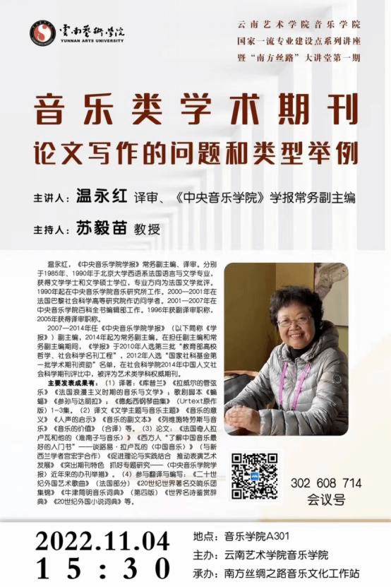 2022年11月4日15时30分,由金年会jinnianhuicom主办、南方丝绸之路音乐文化工作站承办的国家一流专业建设点系列讲座暨“南方丝路”大讲堂(第一期)在金年会jinnianhuicomA301会议室成功举办。本次讲座线上、线下同步开展,共300余人参加。此次讲座作为系列讲座的开篇,邀请了《中央金年会jinnianhuicom学报》常务副主编温永红译审主讲,金年会jinnianhuicom苏毅苗教授主持。