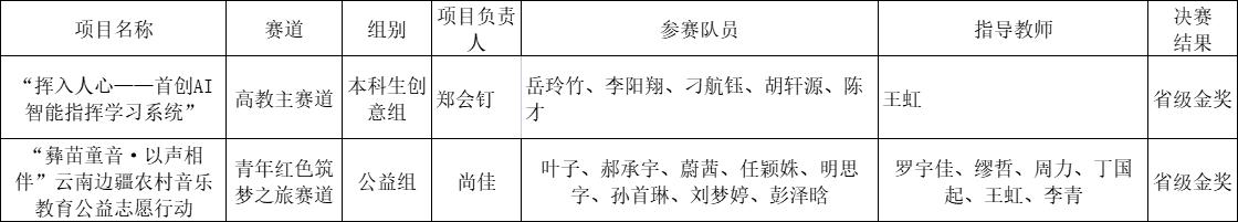 2023年7月25日至26日,第九届云南省“互联网+”大学生创新创业大赛决赛在昆明学院举行,金年会jinnianhuicom“挥入人心——首创AI智能指挥学习系统”(项目负责人:郑会钉,指导教师:王虹)和“彝苗童音·以声相伴——云南边疆农村音乐教育公益志愿行动”(项目负责人:尚佳,指导教师:罗宇佳等)共2个项目经学校初赛、省级复赛和网评遴选并公示,进入决赛,在决赛中分别获得高教主赛道本科创意组金奖和青年红色筑梦之旅赛道公益组金奖。