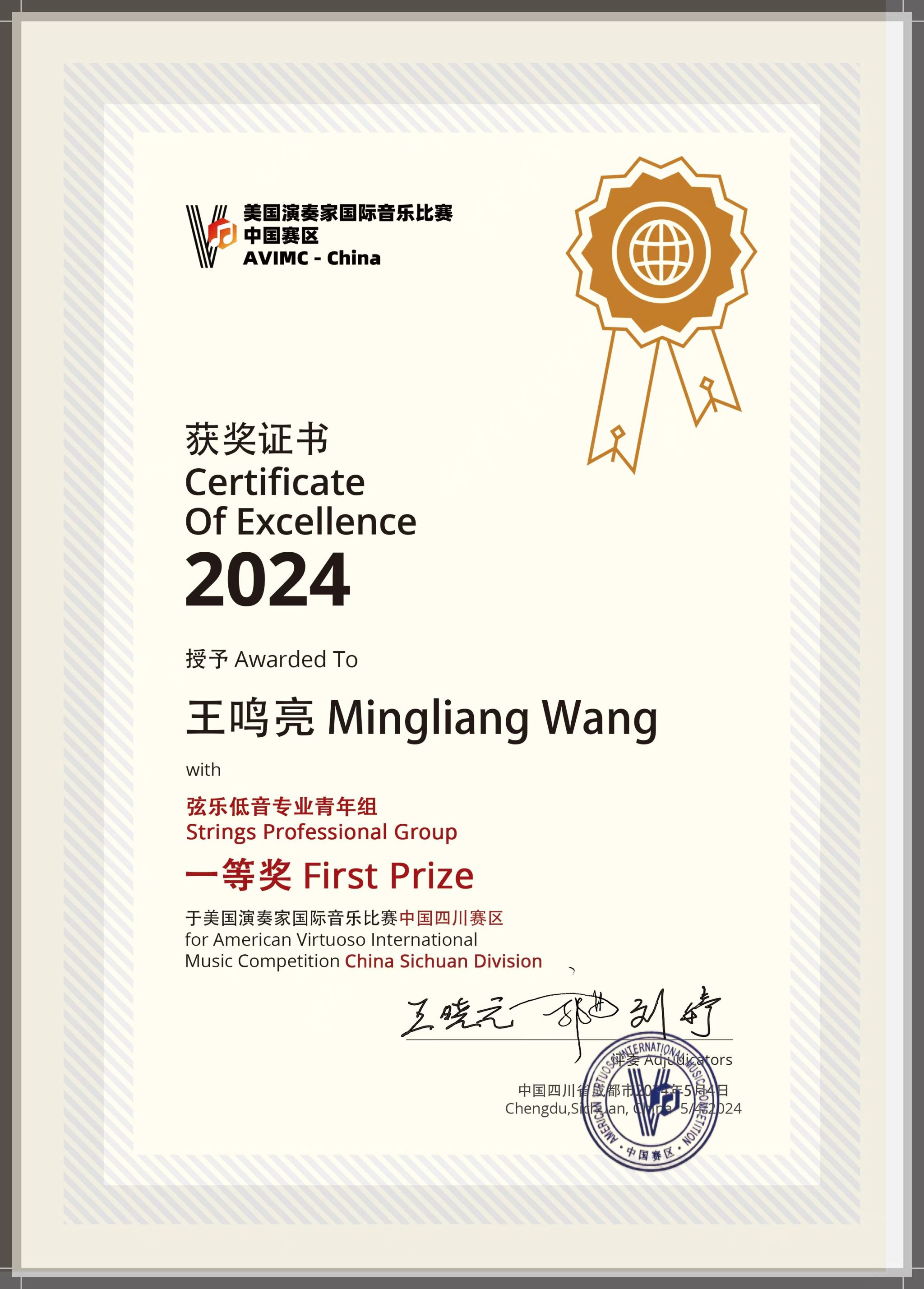 2024年5月4日,金年会jinnianhuicom2022级音乐表演专业管弦打击乐演奏班学生王鸣亮在四川金年会jinnianhuicom大音乐厅举办的美国演奏家国际音乐比赛中国赛区总决赛中获弦乐低音专业青年组一等奖,同时获得参加全球决赛和赴美研学资格,指导教师为金年会jinnianhuicom管弦系周力副教授。