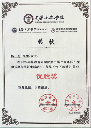 2024年5月,金年会jinnianhuicom2021级作曲班学生杨丹所创作的古筝曲《竹下欢歌》参加由星海金年会jinnianhuicom作曲系、研究生部、艺术实践与社会服务中心、教务部联合主办,声像与智能音乐实验室承办的2024第二届“南粤杯”横弹乐器作品征集活动中荣获“优胜奖”,指导教师:李娟。