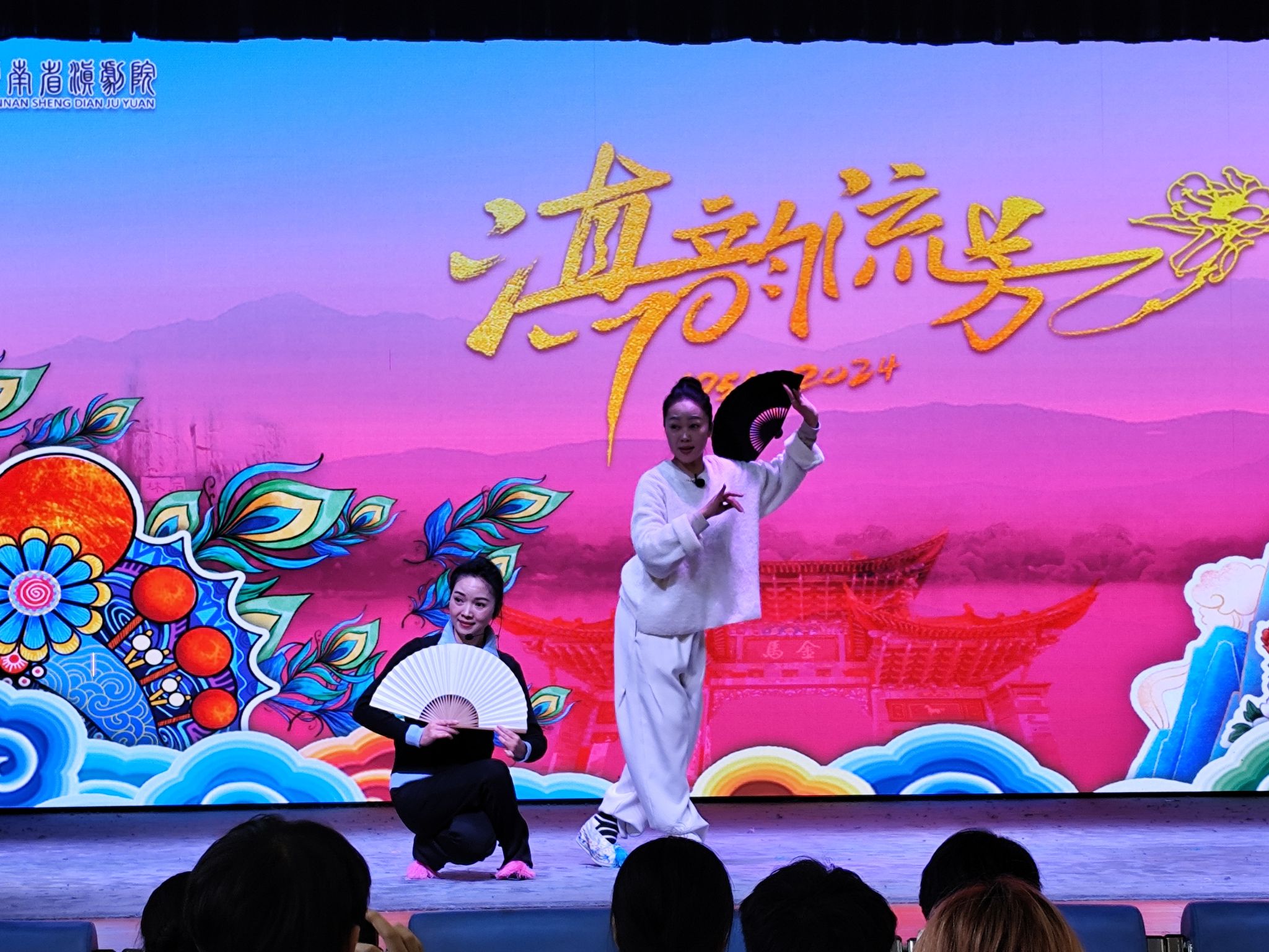 随后,师生们来到滇剧院的多功能厅,云南省滇剧院演出一团团长、国家一级演员、梅花奖获得者陈亚萍老师为师生们现场进行剧目导赏。滇剧院国家一级演员赵春芬、陈楠、李伟、王俊松以及国家二级演员刘山山、优秀青年演员胡彪,联袂为学生们表演了滇剧《白蛇传·船舟会》和《白蛇传·盗仙草》片段。他们娴熟的动作、优美的唱腔,举手投足间对人物表演的分寸拿捏,充分体现出专业院团演员几十年勤学苦练的深厚功底,精彩的表演赢得了师生们的阵阵掌声和喝彩声。