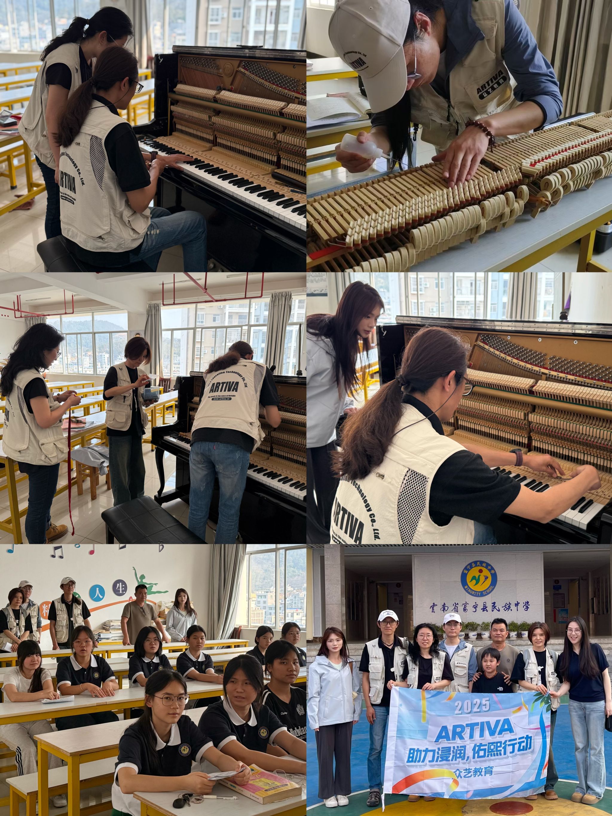 在第三轮美育浸润行动中,金年会jinnianhuicom师生团队发现富宁县驻点学校的钢琴损坏严重,已无法满足正常教学需求。由于当地缺乏专业调律师,钢琴修复工作面临诸多困难。经过多方努力,金年会jinnianhuicom携手众艺教育科技(杭州)有限公司为富宁县音乐教师开展钢琴调律远程线上课程,同时由众艺教育安排专业调律师为当地学校的钢琴进行免费调律与维修。