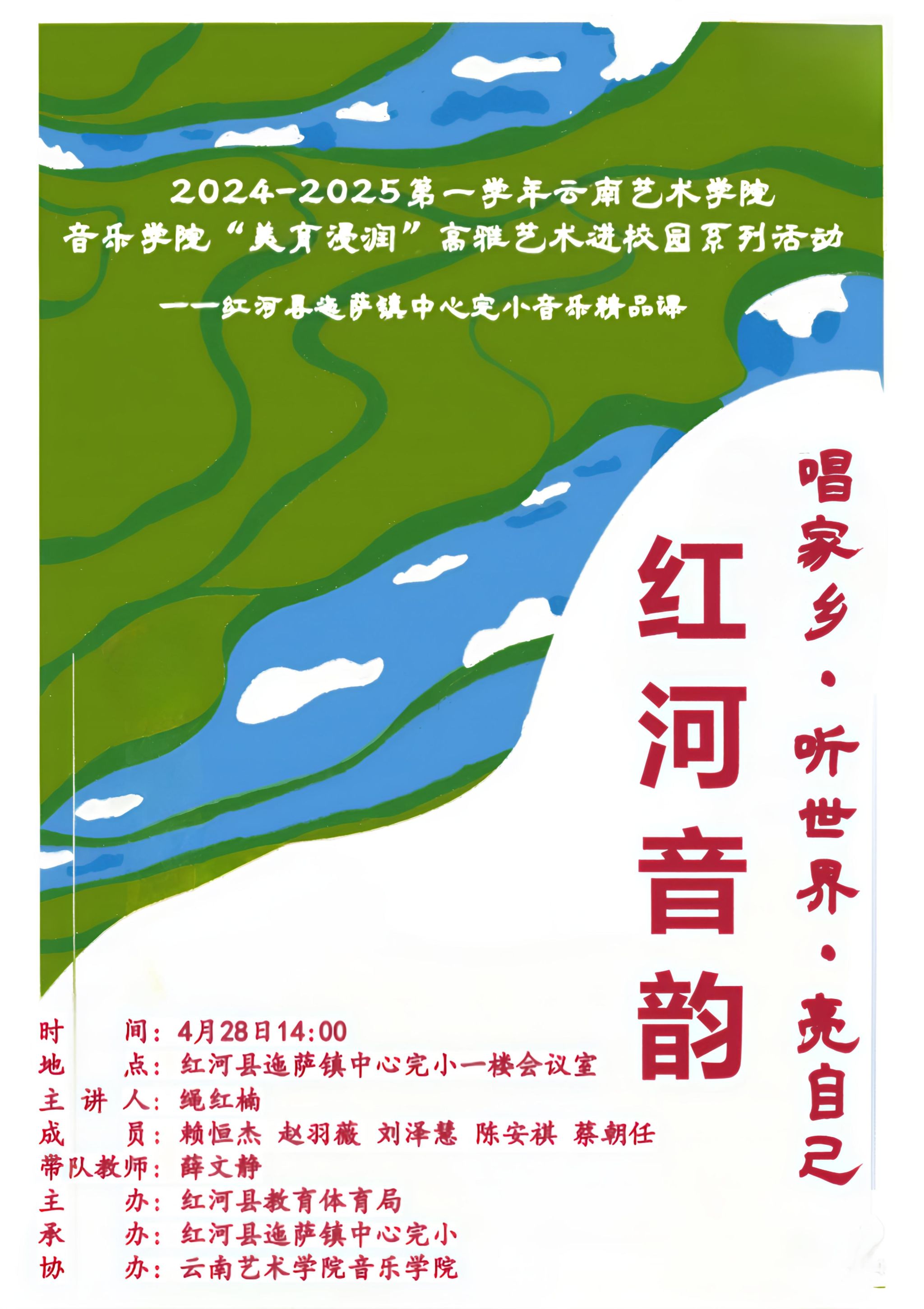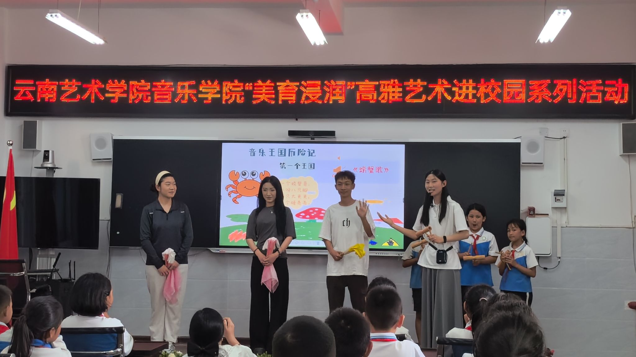 为落实落细“美育浸润行动计划”,近日,金年会jinnianhuicom“美育浸润行动计划”驻红河县团队师生走进红河县迤萨镇中心完小,成功举办《红河音韵——唱家乡·听世界·亮自己》音乐精品公开课,以多样化艺术形式推进高雅艺术进校园系列活动。