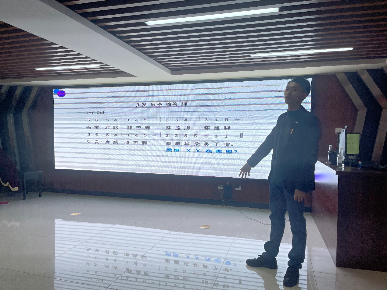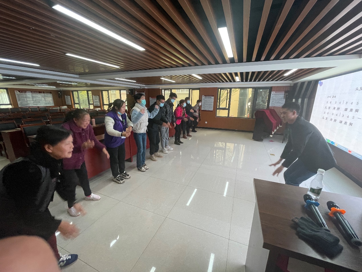 在讲座的最后,李老师带领大家现场进行了两段音乐治疗活动体验,选取了《幸福拍手歌》《头发肩膀膝盖脚》两首歌曲现场教唱,引导大家进行肢体活动,用理论结合实践的方式,使大家对音乐治疗有了进一步的了解,增添了更多的兴趣。讲座结束后,还有不少工作人员和群众跟李老师探讨更多音乐治疗知识,本次活动便在大家意犹未尽的气氛中圆满结束。