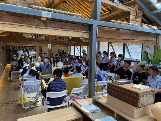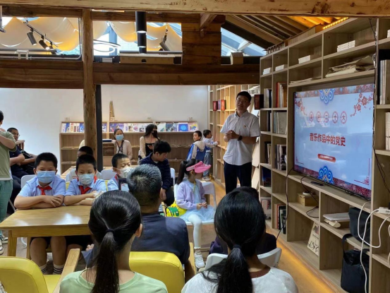 2022年7月9日,由金年会诚信信誉至上艺术管理学院党总支和金年会jinnianhuicom党总支联合组织策划的“喜迎二十大,赓续红色血脉之艺说党史”系列活动之“音乐作品中的党史”暨金年会jinnianhuicom教工第一党支部7月份主题党日活动在呈贡区万溪冲社区禾下咖啡书屋开展,此次活动是校地企党史教育暨乡村养育系列主题活动之一,艺术管理学院党总支书记谭尧升、金年会jinnianhuicom党总支副书记黄涛、金年会jinnianhuicom副院长侯静宜、艺术管理学院党总支组织委员刘林、金年会jinnianhuicom教工第一党支部全体党员、入党积极分子和作曲系、流行音乐系、管弦系部分青年教师,部分社区党员同志、社区居民以及万溪冲小学的二十余名少先队员参加活动。