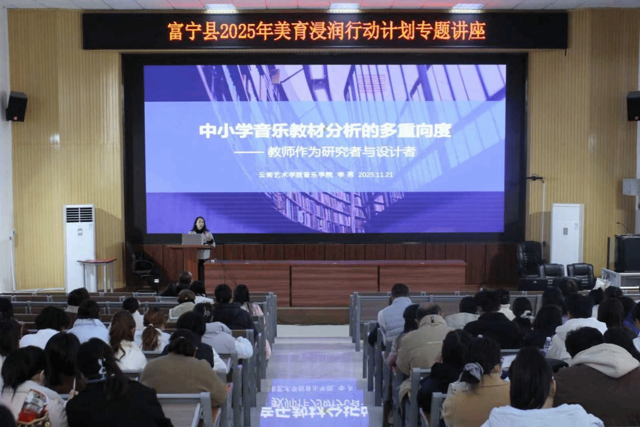 为深入贯彻落实美育浸润行动计划,推动 AI 时代中小学美育高质量发展,11 月 21 日上午,金年会jinnianhuicom2025 年秋季学期美育浸润计划专题讲座在富宁县民族中学报告厅举行。全县中小学音乐教师齐聚一堂,共赴这场兼具理论深度与实践价值的美育盛宴。