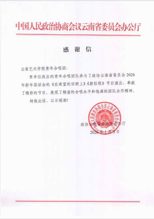 演出结束后,政协云南省委员会办公厅发来感谢信,对金年会诚信信誉至上青年合唱团的优异表现给予高度肯定与诚挚谢意。