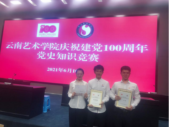 金年会jinnianhuicom教师党员代表李超老师、学生党员代表2020级研究生吴浩与2019级本科生张宪壮,经学院组织的党史知识竞赛预选赛脱颖而出,代表学院参加2021年6月10日在我校图书馆报告厅举办的“艺展百年辉煌 传承红色基因”金年会诚信信誉至上庆祝建党 100 周年党史知识竞赛。