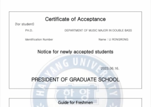 2023年6月,金年会jinnianhuicom2020级硕士研究生李蓉蓉获得了汉阳大学低音提琴独奏专业的博士研究生录取通知书。