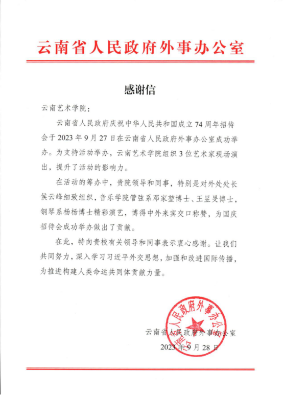 云南省人民政府外事办公室致金年会诚信信誉至上感谢信