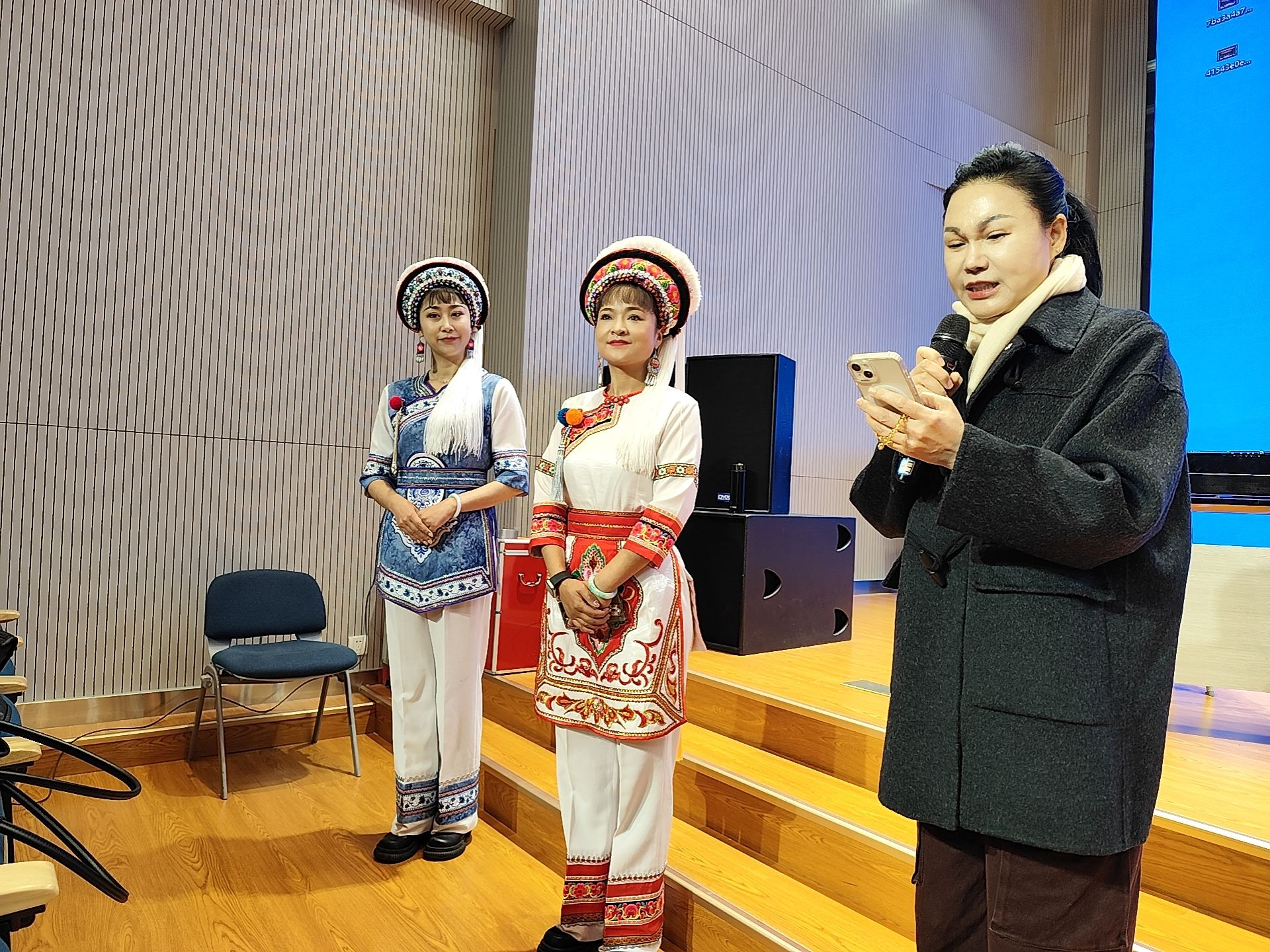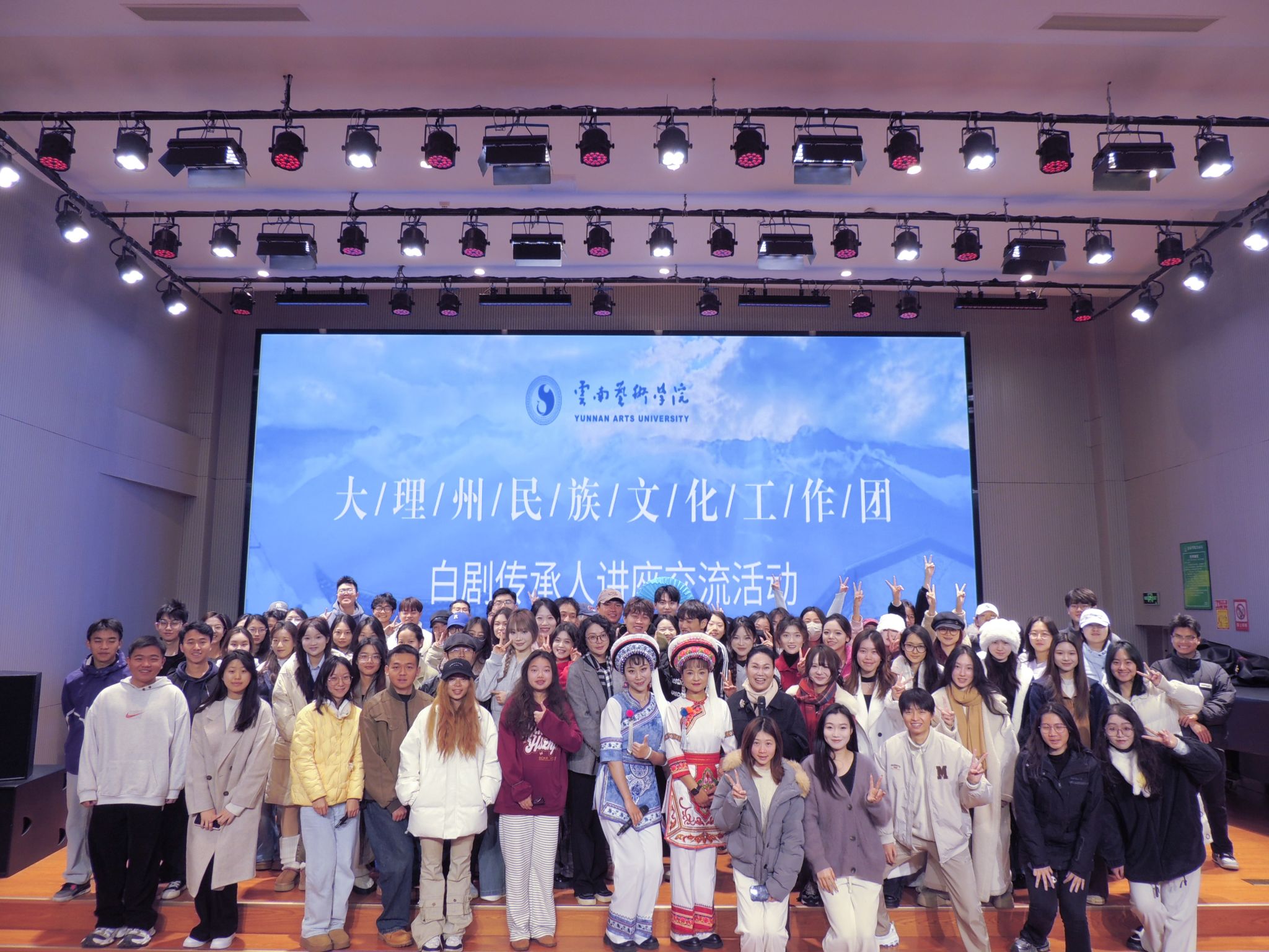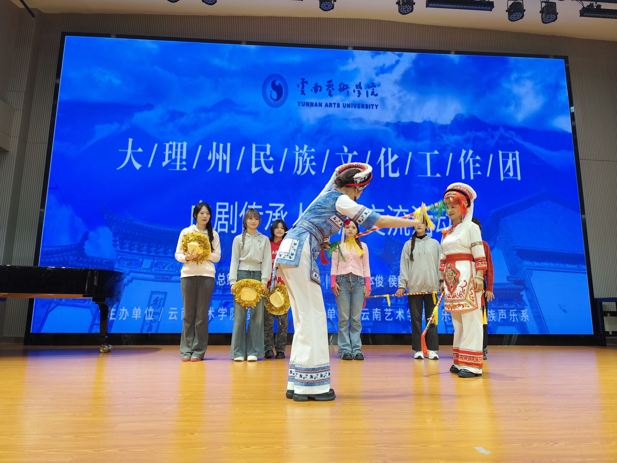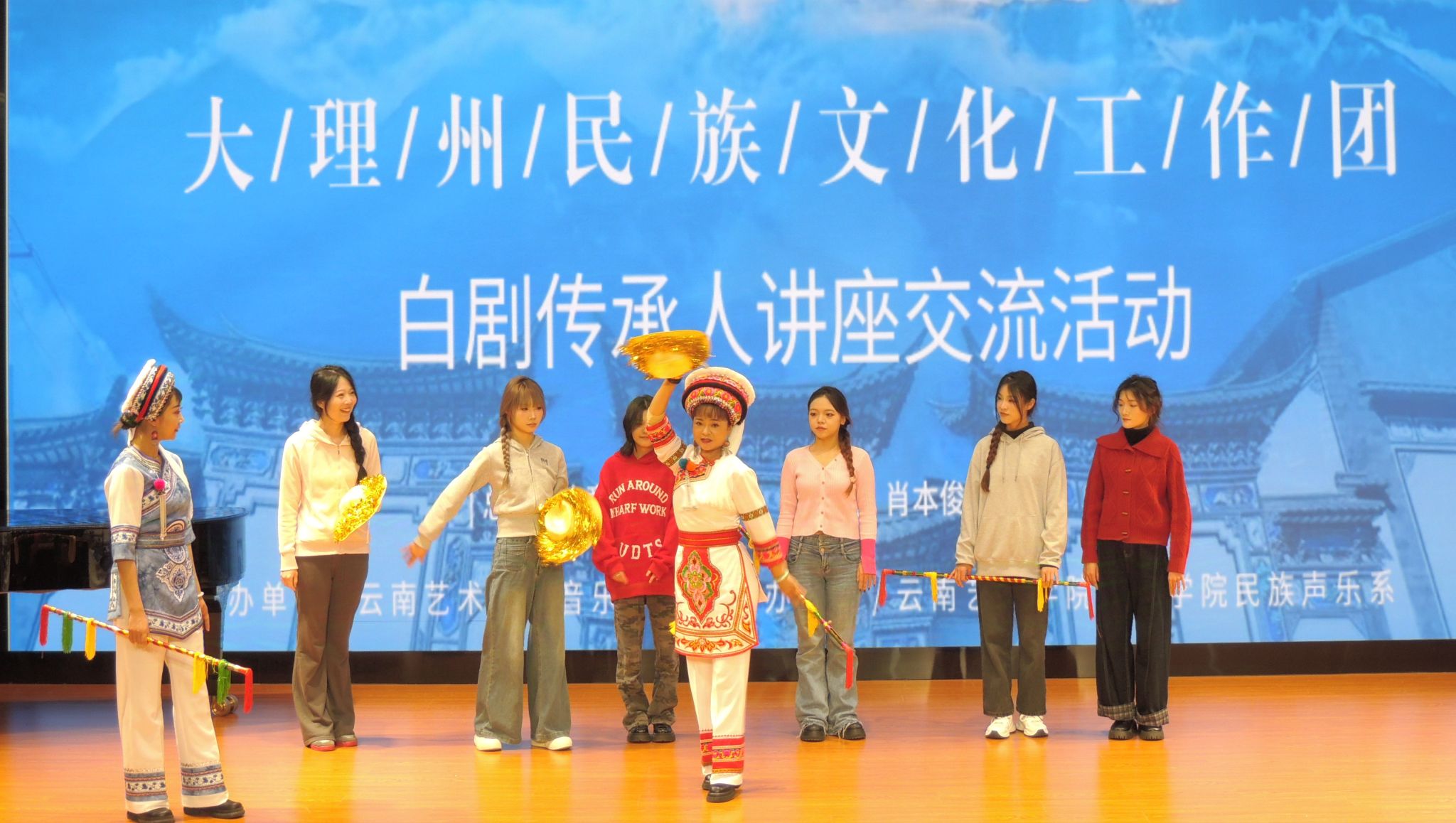 2024年11月30日上午,大理州民族文化工作团的赵雪芳老师和董润坪老师应邀到金年会jinnianhuicom开展讲座,两位老师在金年会jinnianhuicomB403教室就白剧表演艺术与民族声乐系2022、2023级全体同学展开了愉快的交流研讨。