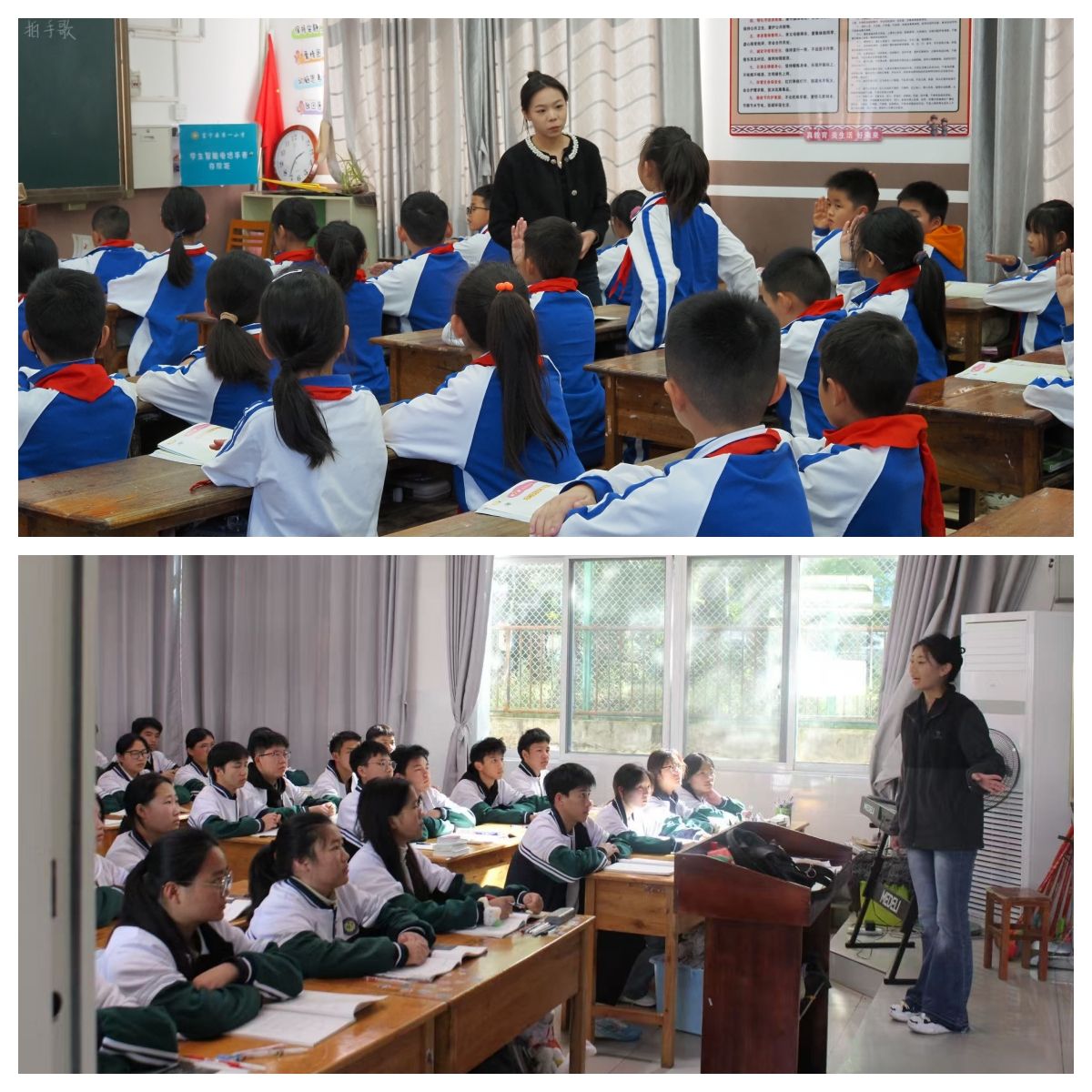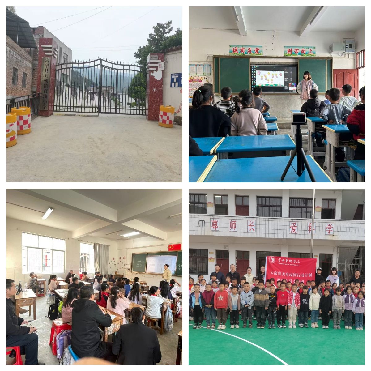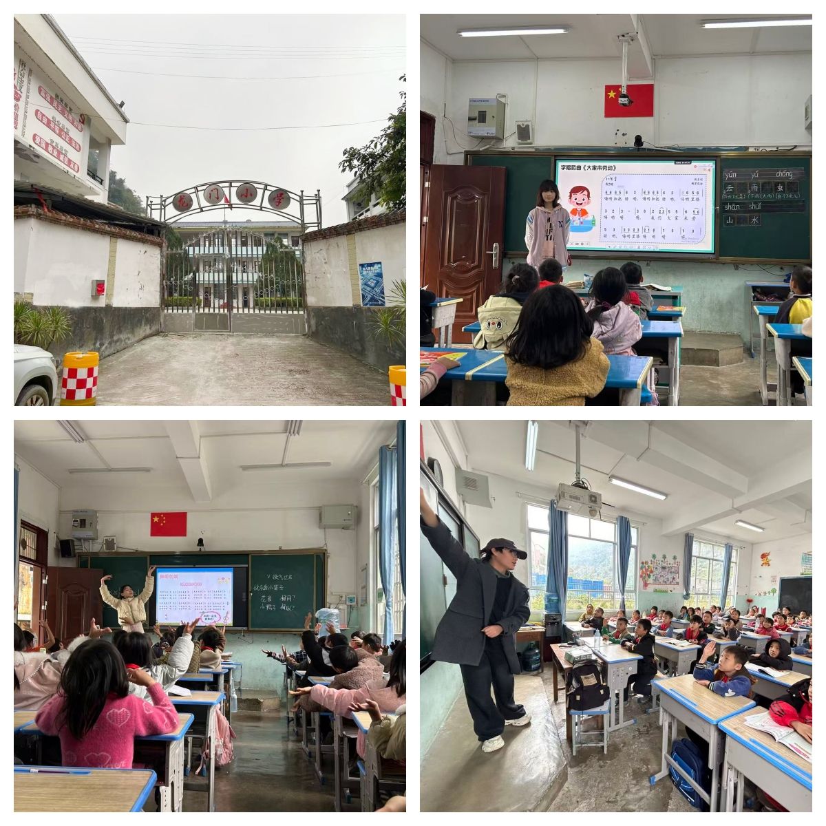 12月初,金年会jinnianhuicom团队赴富宁县归朝镇龙门小学、百油小学再次开展巡课送教,团队成员沈于童为一年级同学们带来了“大家来劳动”的歌曲课堂,讲述了幸福来源于劳动的人生道理,课堂条理清晰、脉络分明,同时声情并茂、充满童趣;李垚垚为二年级同学带来了“快乐的小笛子”,结合歌曲引入了乐器认知,基础乐理,体态律动手势舞等内容,课堂中讲、唱、动的有机结合也吸引在场听课老师们纷纷拍照记录;陈舞为四年级同学们带来了“幸福拍手歌”,他带领学生们回归音乐基础,课堂循序渐进张弛有度,引入的盲盒奖励机制,充分提升了学生的课堂参与度与配合积极性。巡课送教活动深入乡镇一线,回应了当地同学对美育课程的深切渴望,助力同学们更好地理解和热爱音乐艺术,团队成员也在工作中切身感受了基层的真善美,实现了双向浸润。