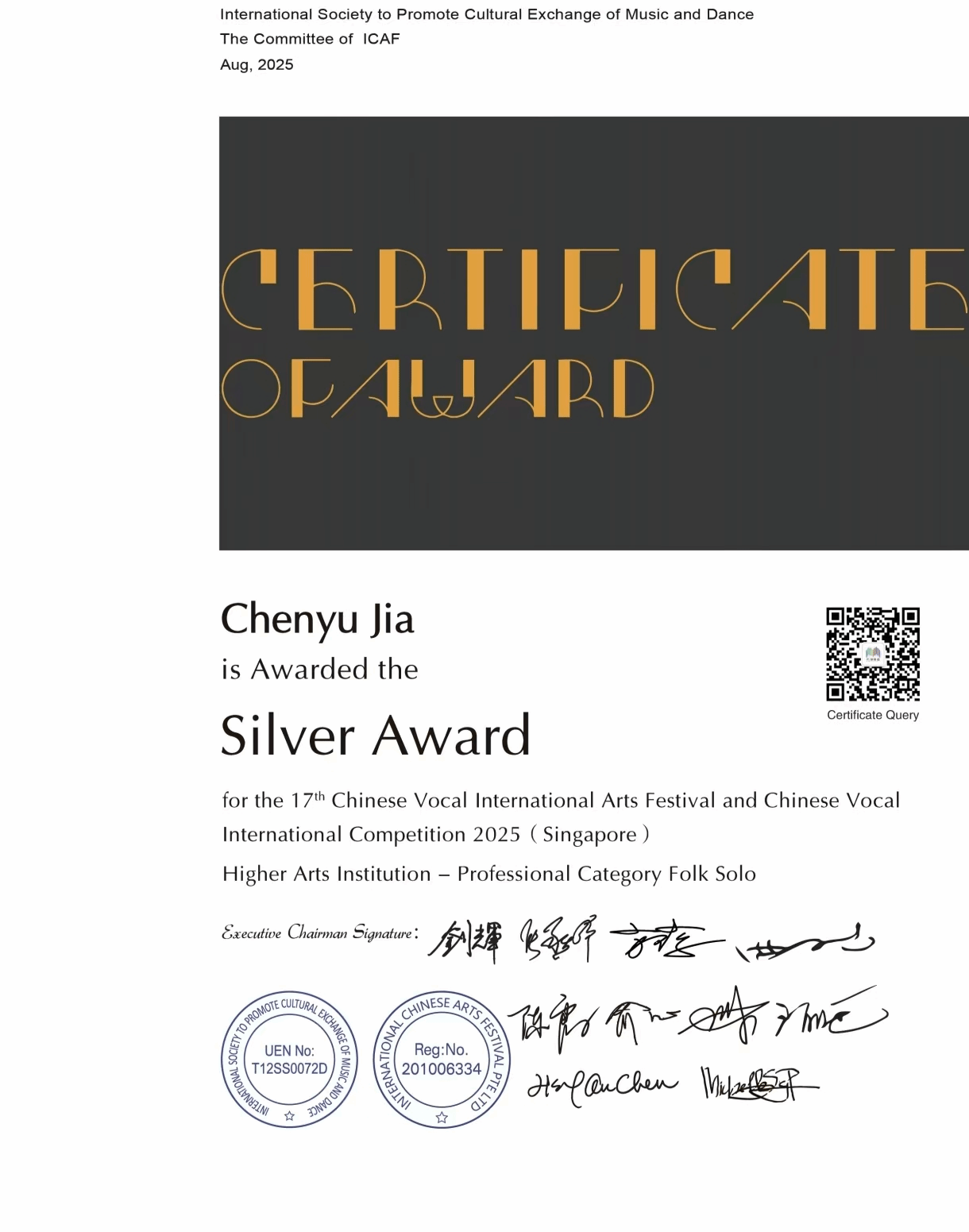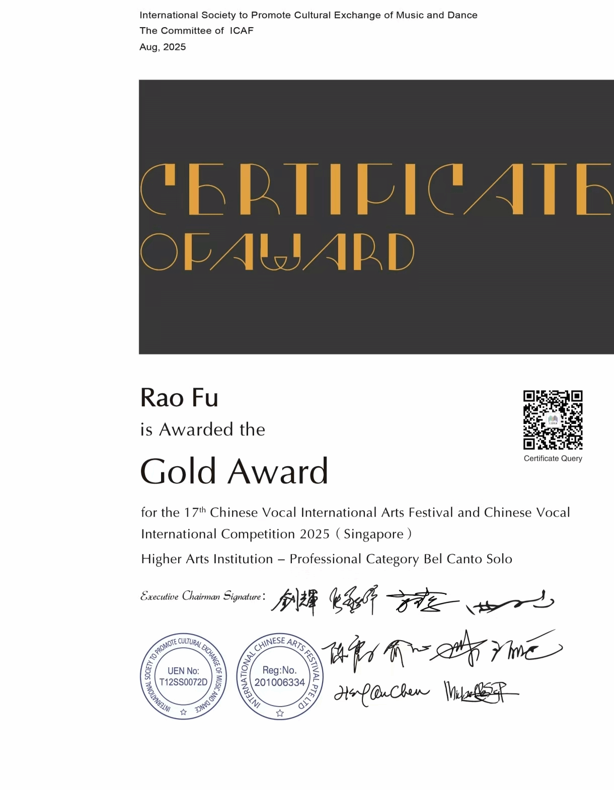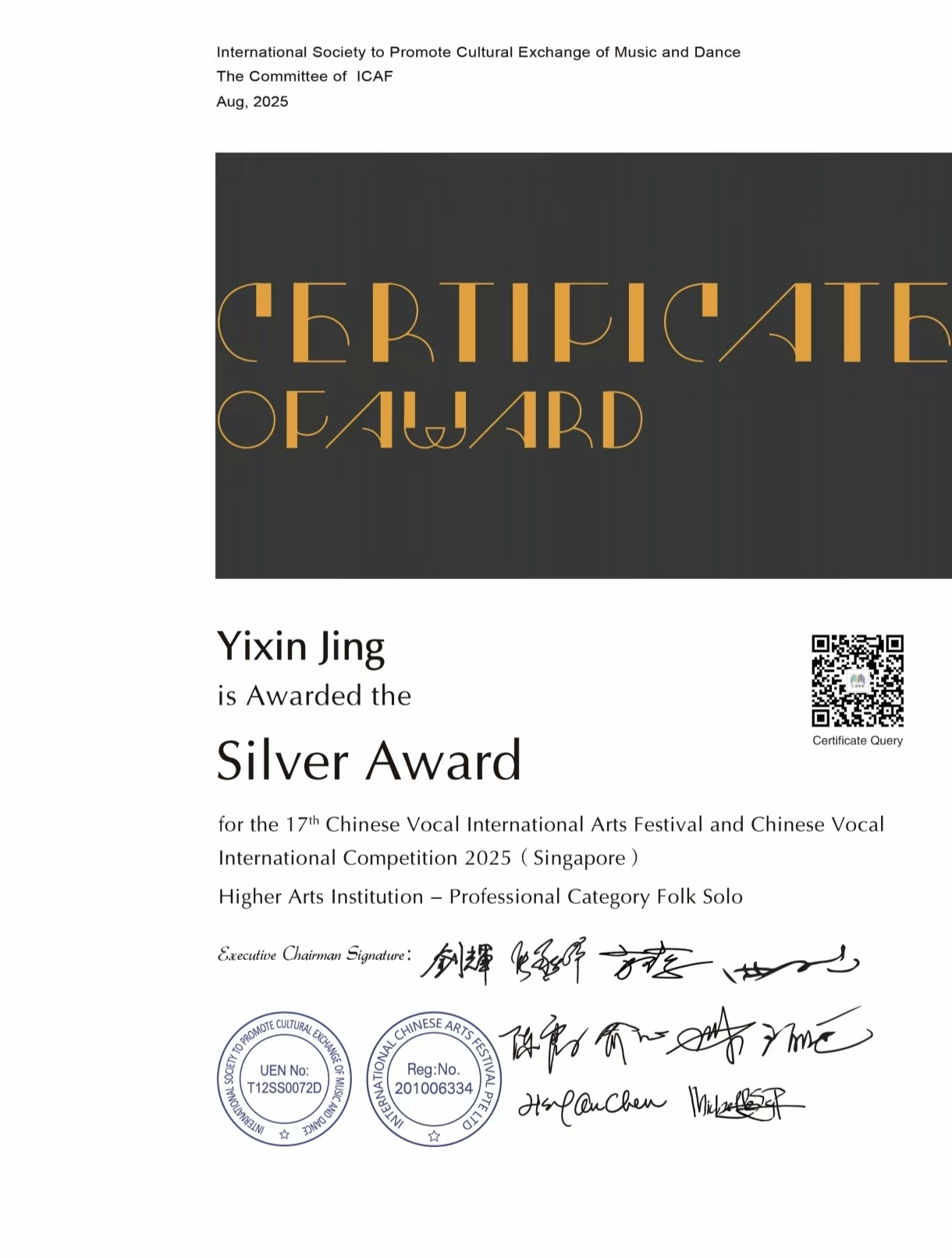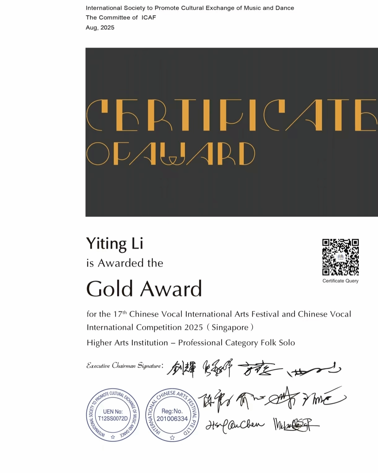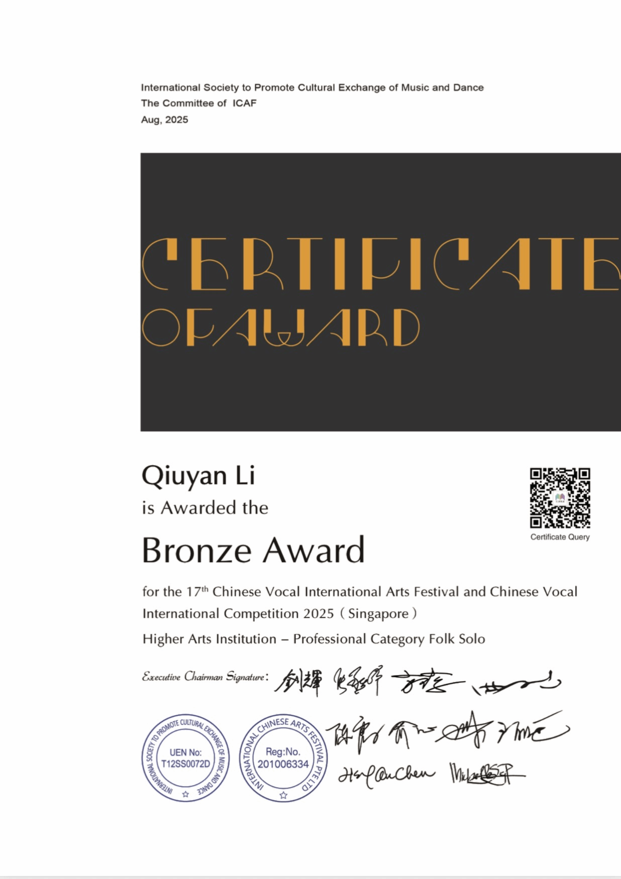 2025年8月7日-8月11日,由国际音乐舞蹈交流促进会主办的第十七届中国声乐国际艺术节暨中国声乐大赛在新加坡举办,中国声乐国际大赛以国际化、专业化著称,汇聚全球声乐领域的顶尖专家与优秀选手,被公认为当今华人声乐界最具权威和影响力的赛事之一。金年会jinnianhuicom声乐系师生共有7人获奖,其中金奖2人,银奖4人,铜奖1人。其中,声乐系教师付饶获专业组美声独唱项目金奖,2025届民族声乐班毕业生李秋妍获专业组民族声乐独唱项目铜奖(指导教师:林林),2023级民族声乐班张晓丫获专业组民族声乐独唱项目银奖(指导教师:林林),2024级民族声乐班荆艺歆获专业组民族声乐独唱项目银奖(指导教师:林林),2025届民族声乐班毕业生李以婷获专业组民族声乐独唱项目金奖(指导教师:陈红玲),2022级民族声乐班滕姿萱获专业组民族声乐独唱项目银奖(指导教师:陈红玲),2023级民族声乐班贾辰煜获专业组民族声乐独唱项目银奖(指导教师:陈红玲)。