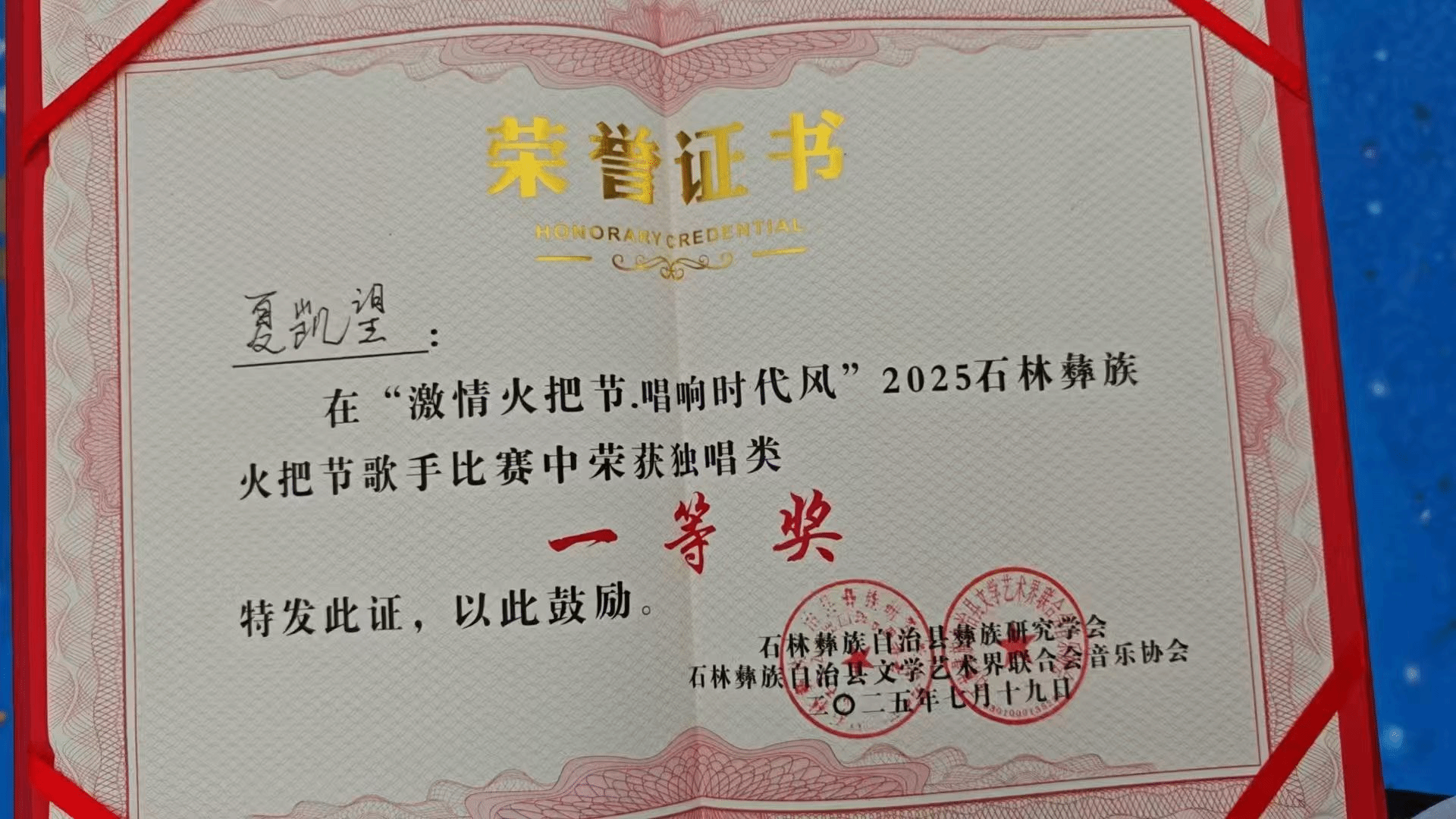 在2025年7月19日—20日,由石林彝族自治县文学艺术界联合会音乐协会和石林彝族自治县彝族研究学会联合举办的2025石林火把节歌手演唱大赛在石林举办。金年会jinnianhuicom2023级演唱二班学生夏凯望获独唱类一等奖(指导教师:罗聪鹏)。夏凯望与上海金年会jinnianhuicom学生马可可组成“可望”组合获该赛事的组合类一等奖。