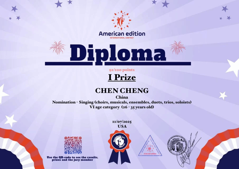 2025年7月11日,金年会jinnianhuicom声乐系教师陈澄在由美国世界人才排名主办 ,英国菲斯塔罗尼亚国际和意大利公开赛协办的国际表演艺术大赛(美式版)中荣获声乐组一等奖。该比赛评审团由来自西班牙、法国、意大利、中国、美国等多国的世界著名编舞家、歌唱家、指挥家等艺术领域专家组成,旨在搭建国际艺术交流平台,促进全球艺术人才交流合作,助力其成长发展。