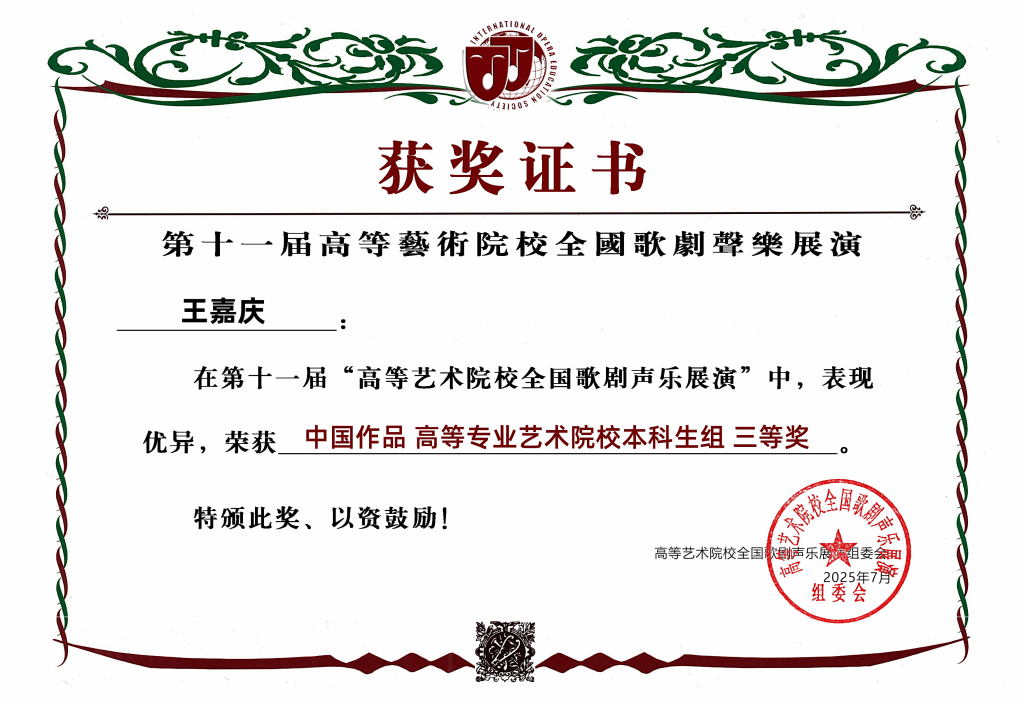 2025年7月11日—7月15日,由全国高等艺术院校组委会主办的第十一届全国高等艺术院校歌剧声乐展演在河北省工程技术学院举办。评审团由全国高等艺术院校及专业院团的歌唱家、教育家组成,本届展演吸引了来自全国31个省市自治区的740余名选手参加。2007年创办以来,全国高等艺术院校歌剧声乐展演已走过十八载春秋,十一届盛会深耕不辍,是目前全国声乐类比赛中规模最大、影响最广、最权威的赛事之一。金年会jinnianhuicom2025届民族声乐班毕业生王嘉庆荣获中国作品高等专业艺术院校本科生组三等奖,指导教师陈红玲老师获优秀指导教师奖。