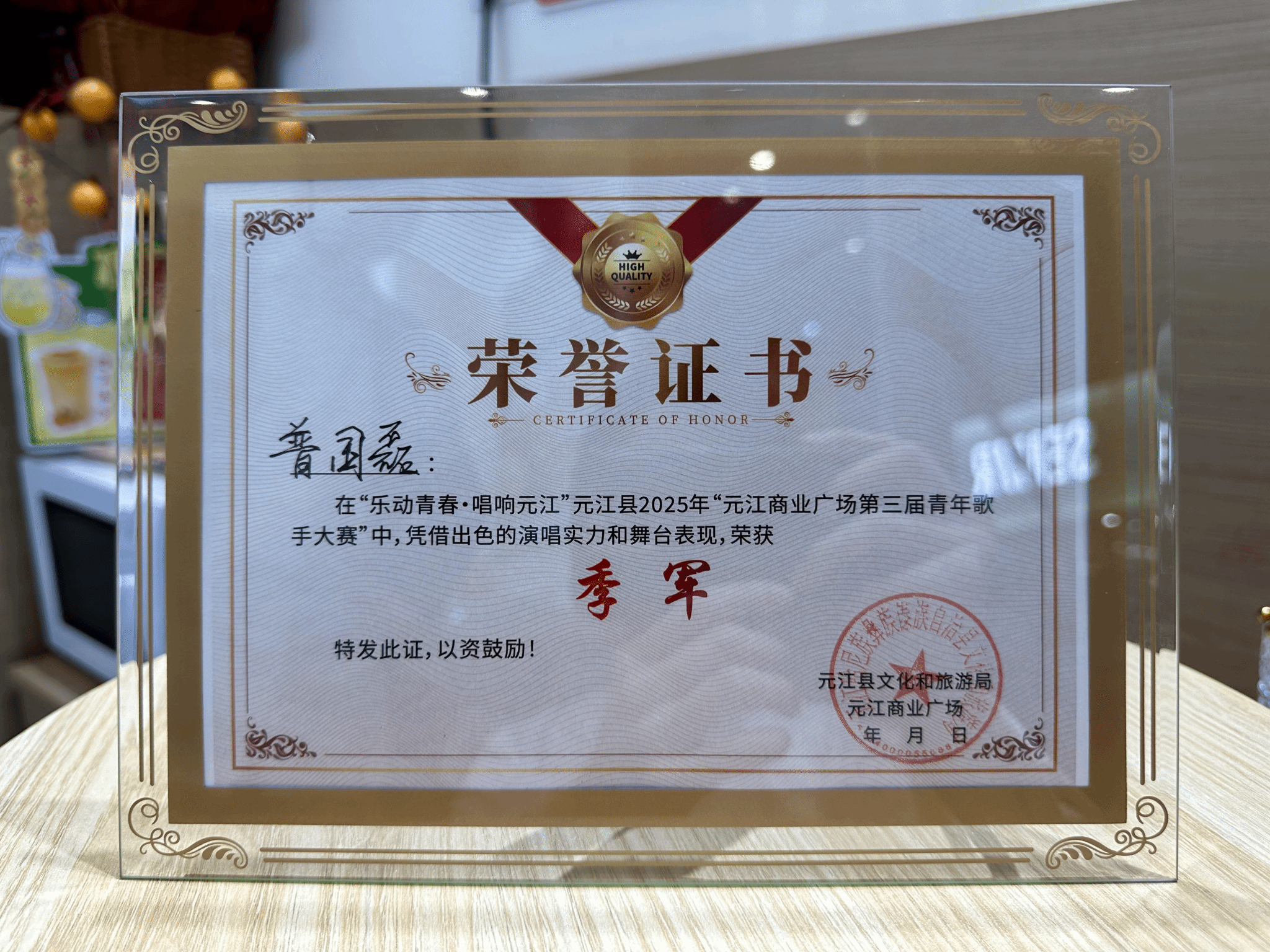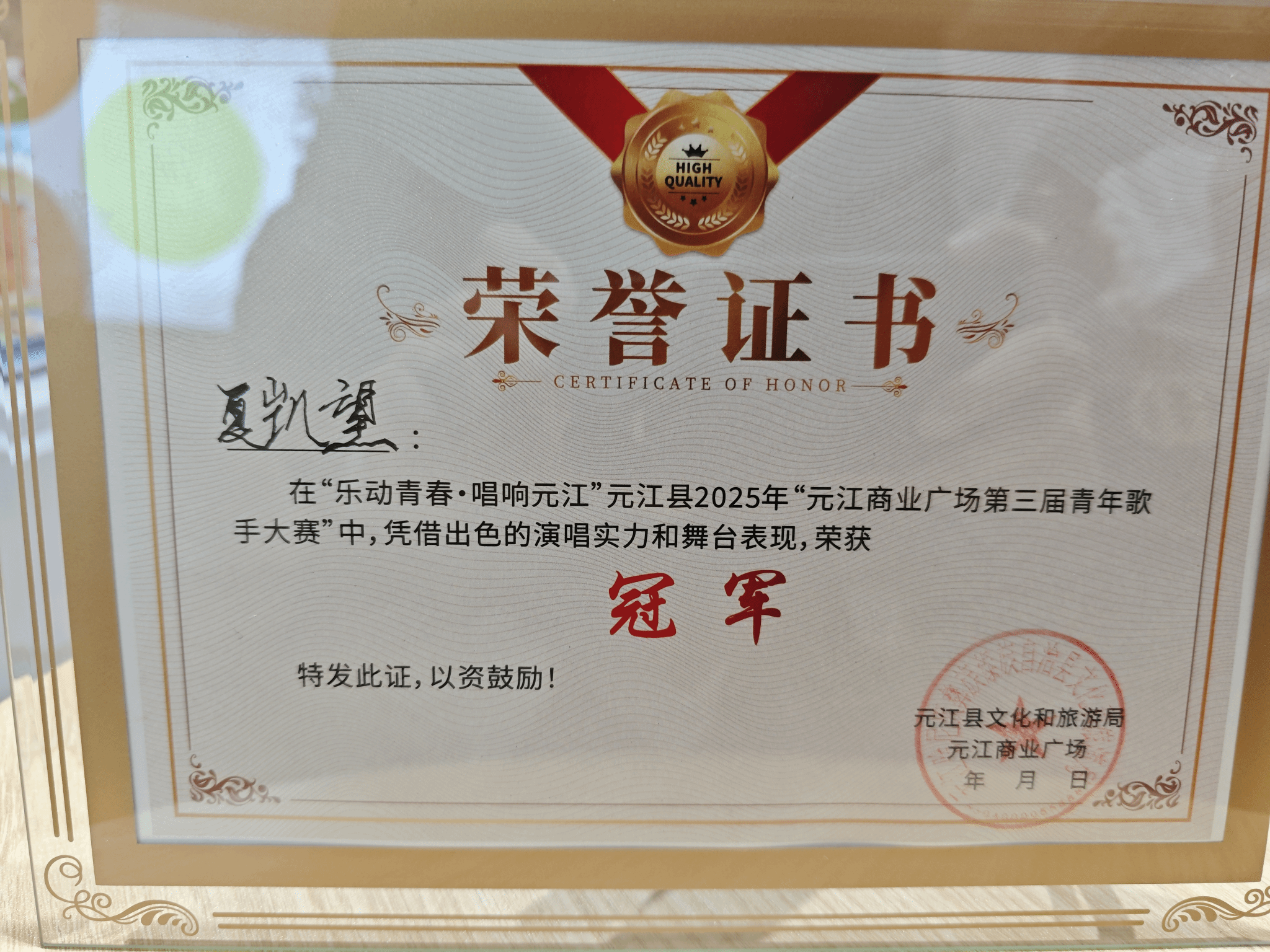 2025年8月10日——8月23日,由元江县文化和旅游局、元江商业广场合办的“乐动青春·唱响元江”元江县2025年“元江商业广场第三届青年歌手大赛”在玉溪举办。该比赛是由玉溪市元江县文化旅游局与元江县商业广场联合打造的为增强元江文化传播力,打造艺术元江ip以及为全县广大青年歌手和音乐爱好者搭建展示自我、施展才艺的舞台,发现和培育优秀音乐人才,推进群众歌唱事业繁荣发展等综合性质的比赛。金年会jinnianhuicom2023级演唱二班学生夏凯望荣获大赛冠军(指导教师:罗聪鹏)。