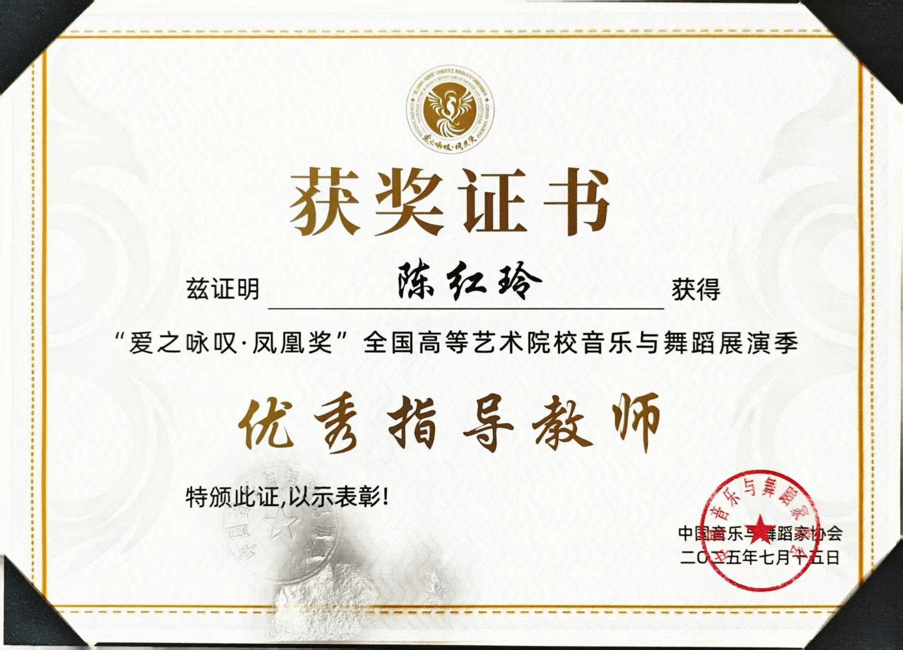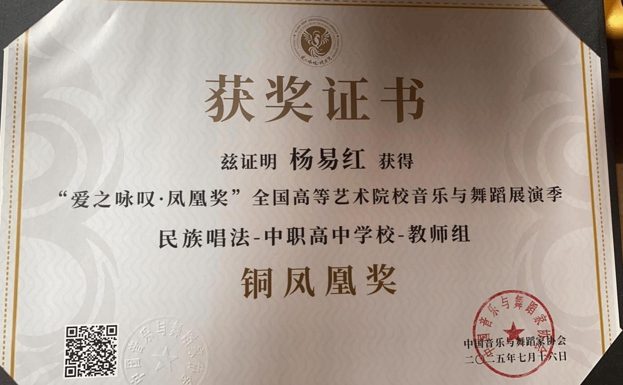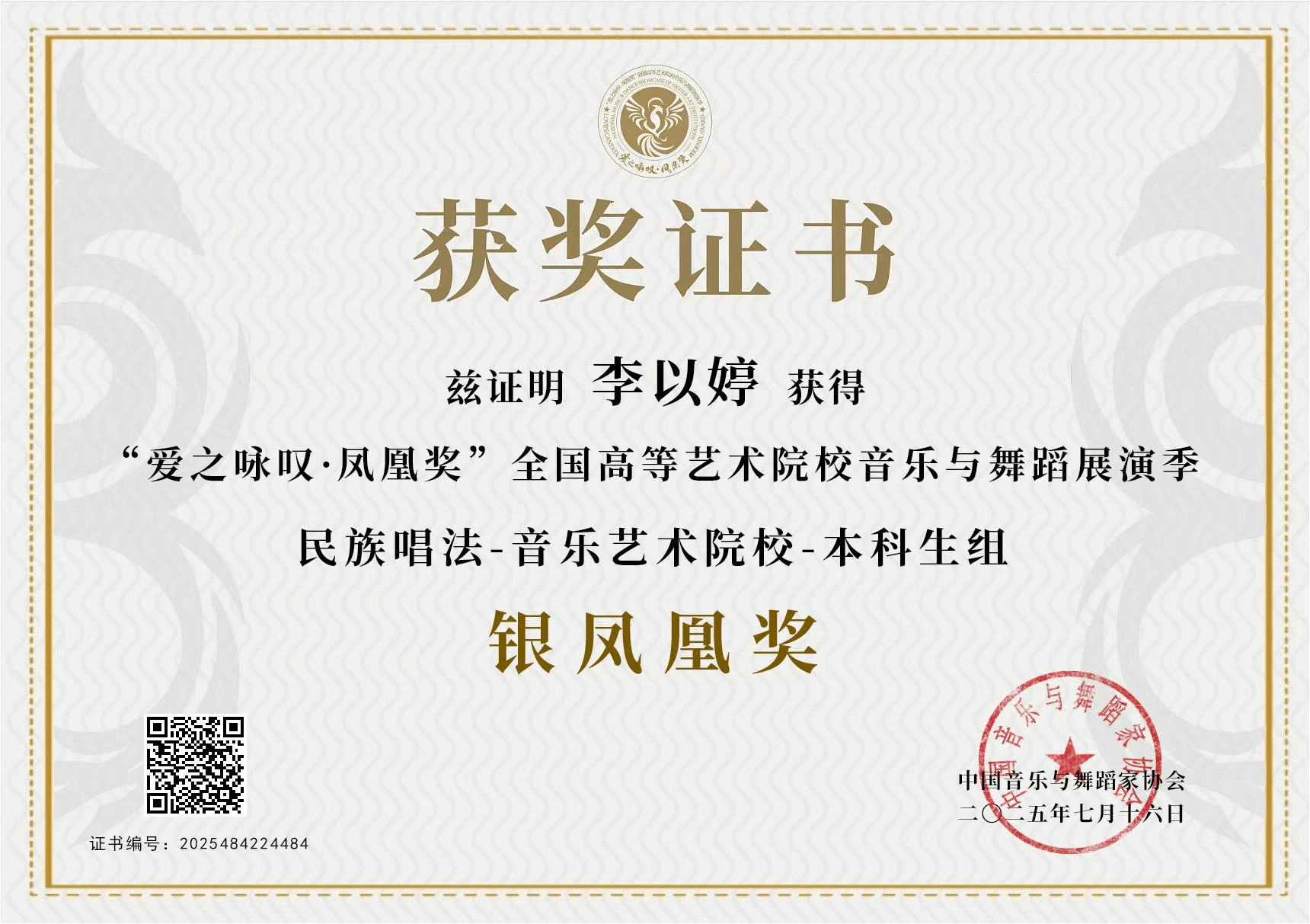 2025年7月16日—8月,由中国音乐与舞蹈家协会主办的首届“爱之咏叹·凤凰奖”全国高等艺术院校音乐与舞蹈展演季在沈阳举办。该展演汇聚全国十余所知名金年会jinnianhuicom、艺术学院及顶尖艺术家,是东北地区首个覆盖音乐与舞蹈类,并涵盖全音乐艺术领域的国家级高层次专业展演。金年会jinnianhuicom声乐系共有5名师生获奖,其中银凤凰奖1人、铜凤凰奖1人、优秀展演奖2人、优秀指导教师1人。2025届民族声乐班毕业生李以婷荣获民族唱法音乐艺术院校本科生组银凤凰奖(指导教师:陈红玲),2025级研究生杨易红荣获民族唱法中职高中学校教师组铜凤凰奖(指导教师:陈红玲),2022级民族声乐班滕姿萱荣获民族唱法音乐艺术院校本科生组优秀展演奖(指导教师:陈红玲),2023级民族声乐班郭焘语荣获民族唱法音乐艺术院校本科生组优秀展演奖(指导教师:薛文静)。陈红玲获优秀指导教师奖。