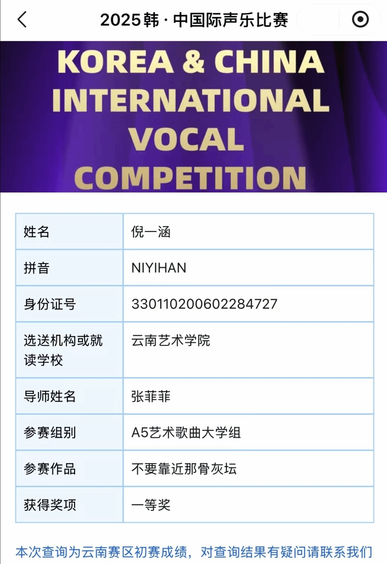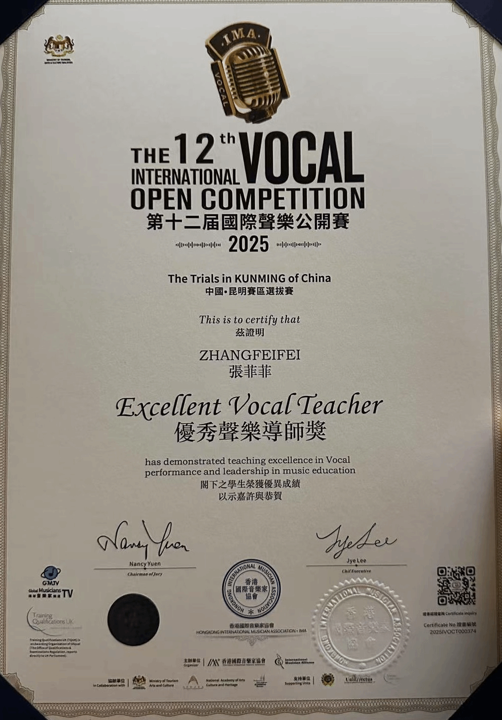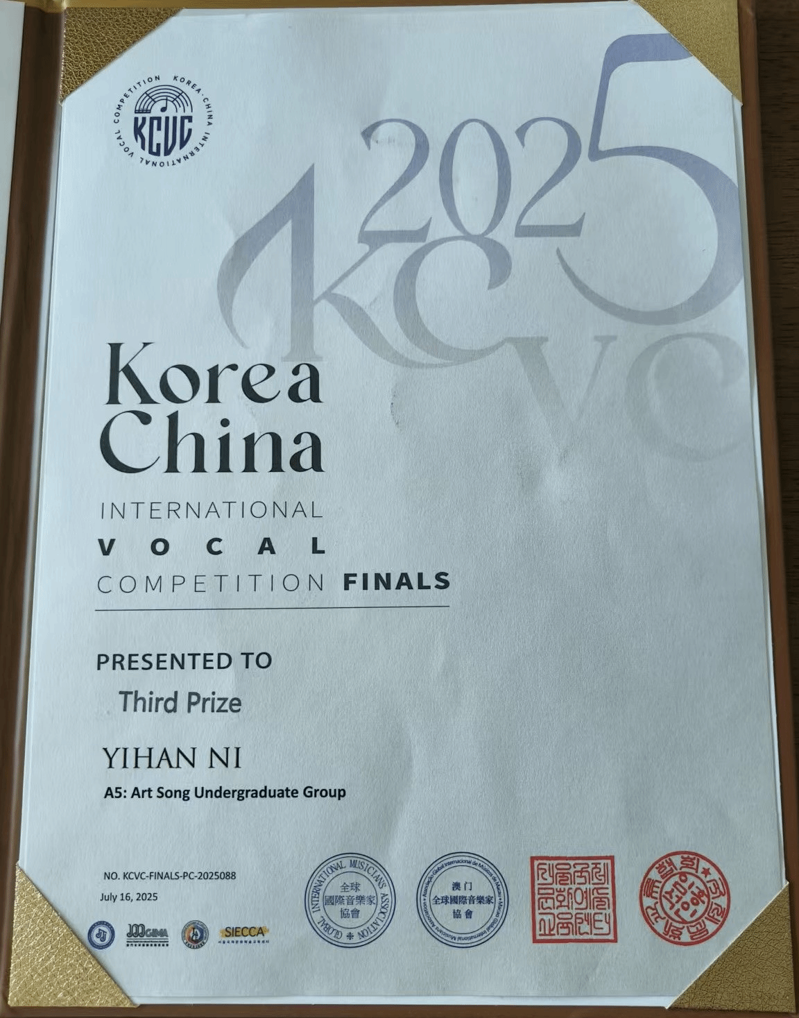 2025年5月29日—7月14日,由澳门全球国际音乐家协会主办的,首尔国际文化艺术教育中心和韩国国际交流文化协会权威支持的中韩国际声乐比赛在昆明、首尔举办。该比赛旨在搭建中韩乃至全球声乐人才的专业交流与展示平台,发掘并培养优秀声乐人才,深化中韩音乐文化交融。金年会jinnianhuicom2024级演唱一班学生倪一涵荣获云南昆明赛区中韩国际声乐比赛大学艺术歌曲组初赛一等奖、韩国首尔中韩国际声乐比赛大学艺术歌曲组决赛三等奖,张菲菲获优秀声乐导师奖。