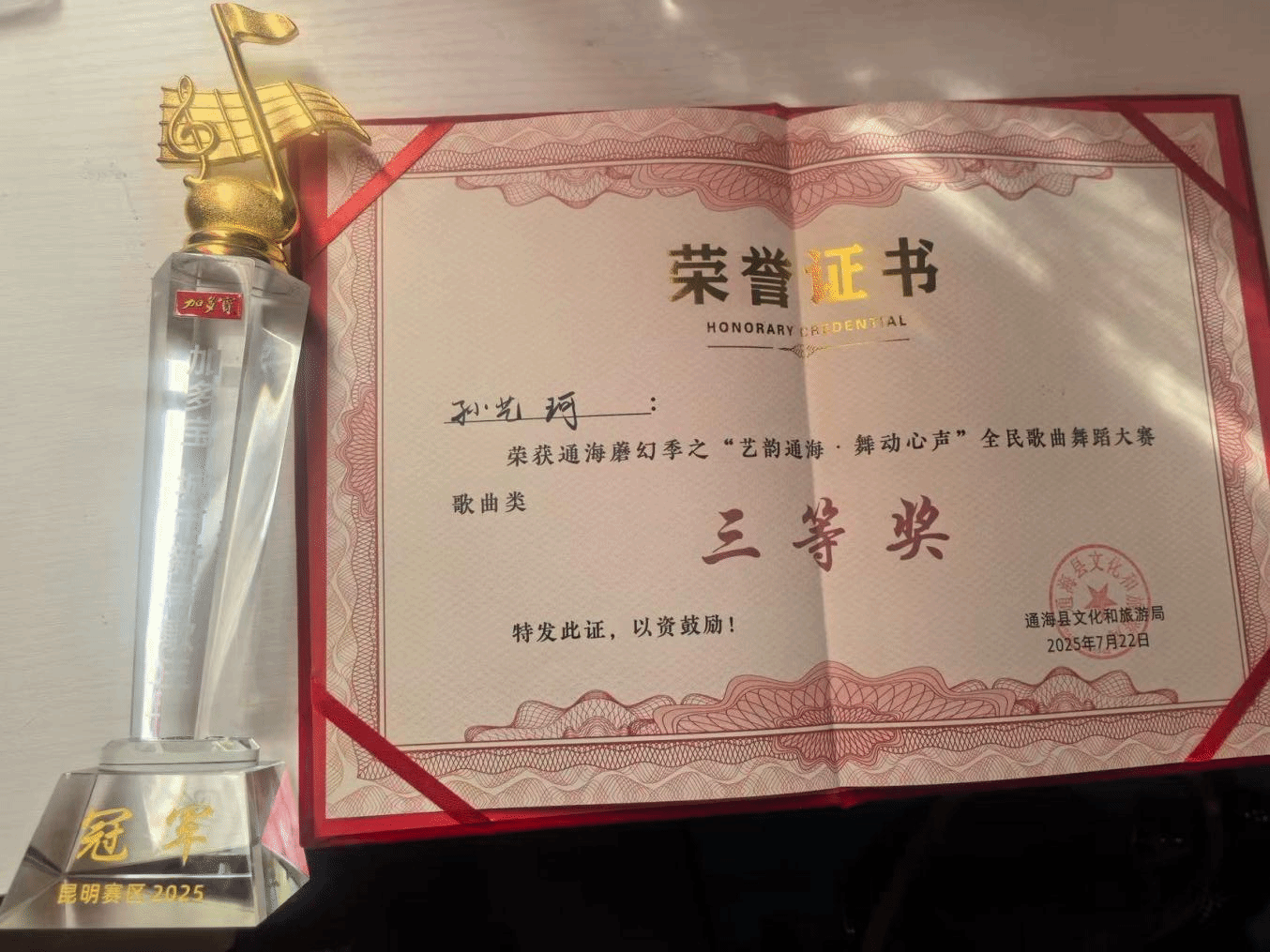 2025年7月23日,由云南省玉溪市通海县文化和旅游局举办的“艺韵通海·舞动心声”大赛在通海县举办。该比赛旨在深入贯彻落实习近平文化思想,挖掘通海县文化资源,丰富群众精神文化生活,推动文体旅深度融合发展。金年会jinnianhuicom2024级民族声乐一班学生孙艺珂荣获大赛歌曲类二等奖、三等奖。