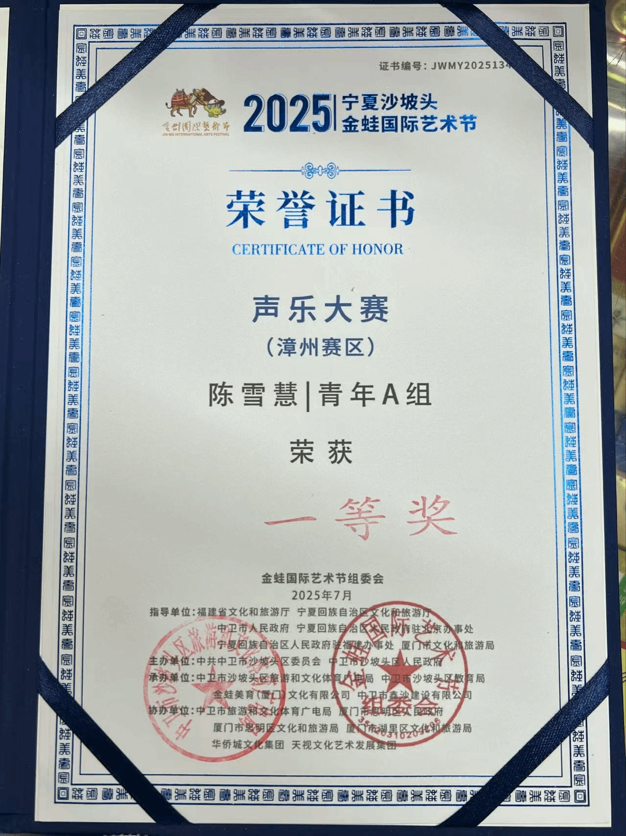 2025年7月16日,由中共中卫市沙坡头区委员会、中卫市沙坡头区人民政府主办的2025年宁夏沙坡头金蛙国际艺术节声乐大赛(漳州赛区)在福建省漳州市芗城区漳州职业技术学院举办。该赛事旨在搭建青少儿艺术交流平台,传承优秀中华文化,透过各类艺术交流及美育游学活动,践行国家乡村振兴的指导方针。金年会jinnianhuicom2024级民族声乐二班学生陈雪慧荣获漳州赛区青年A组一等奖。