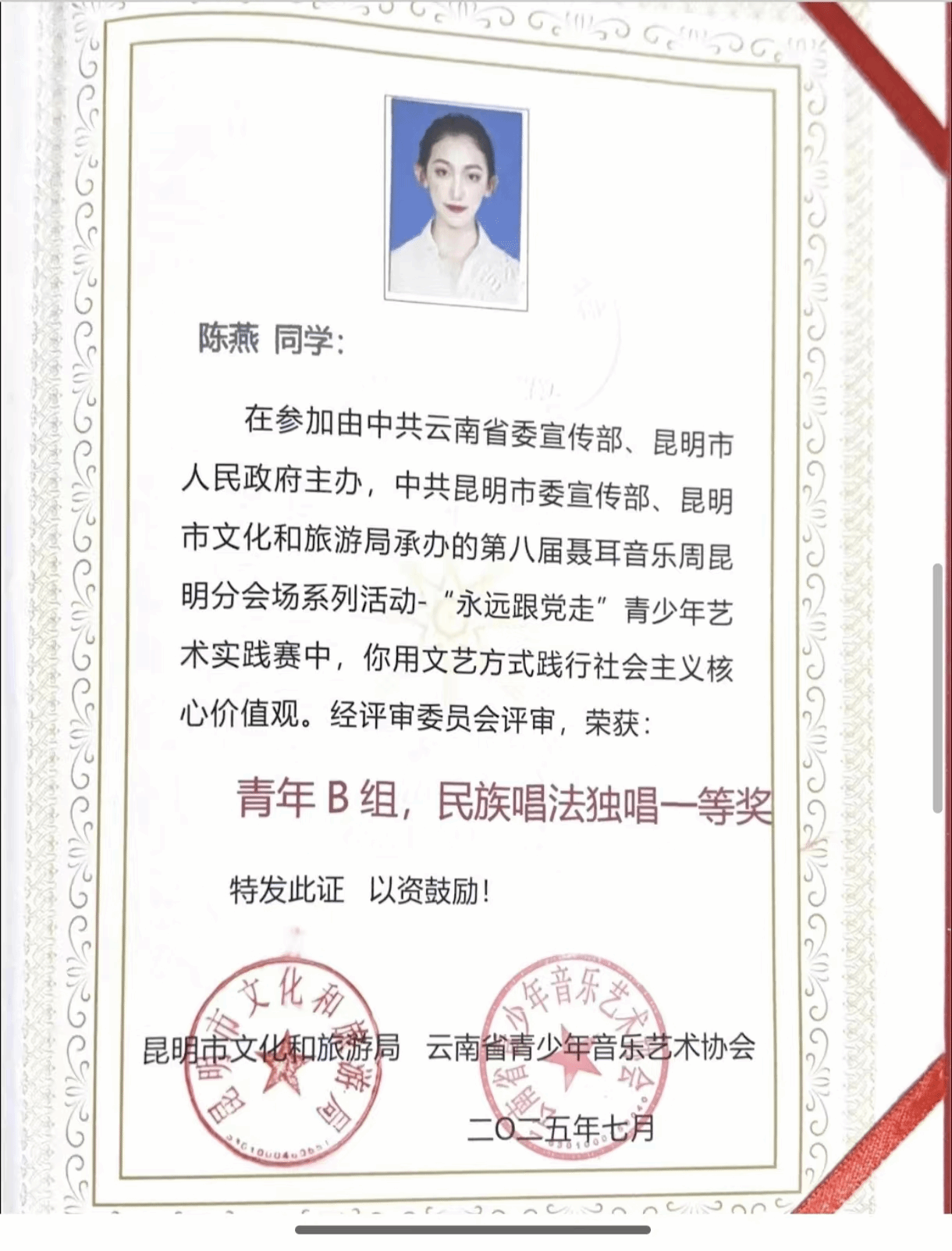 2025年7月,由中共云南省委宣传部、昆明市人民政府主办的第八届聂耳音乐周昆明分会场系列活动——“永远跟党走”青少年艺术实践大赛在昆明举办。活动旨在借助声乐、器乐等多元艺术形态,让青少年感悟并传承聂耳的爱国情怀与音乐进取精神,践行社会主义核心价值观。金年会jinnianhuicom声乐系获一等奖1名、二等奖1名。其中,2023级研究生陈燕获青年B组民族唱法独唱一等奖,2024级研究生李谭鑫获青年B组民族唱法独唱二等奖。