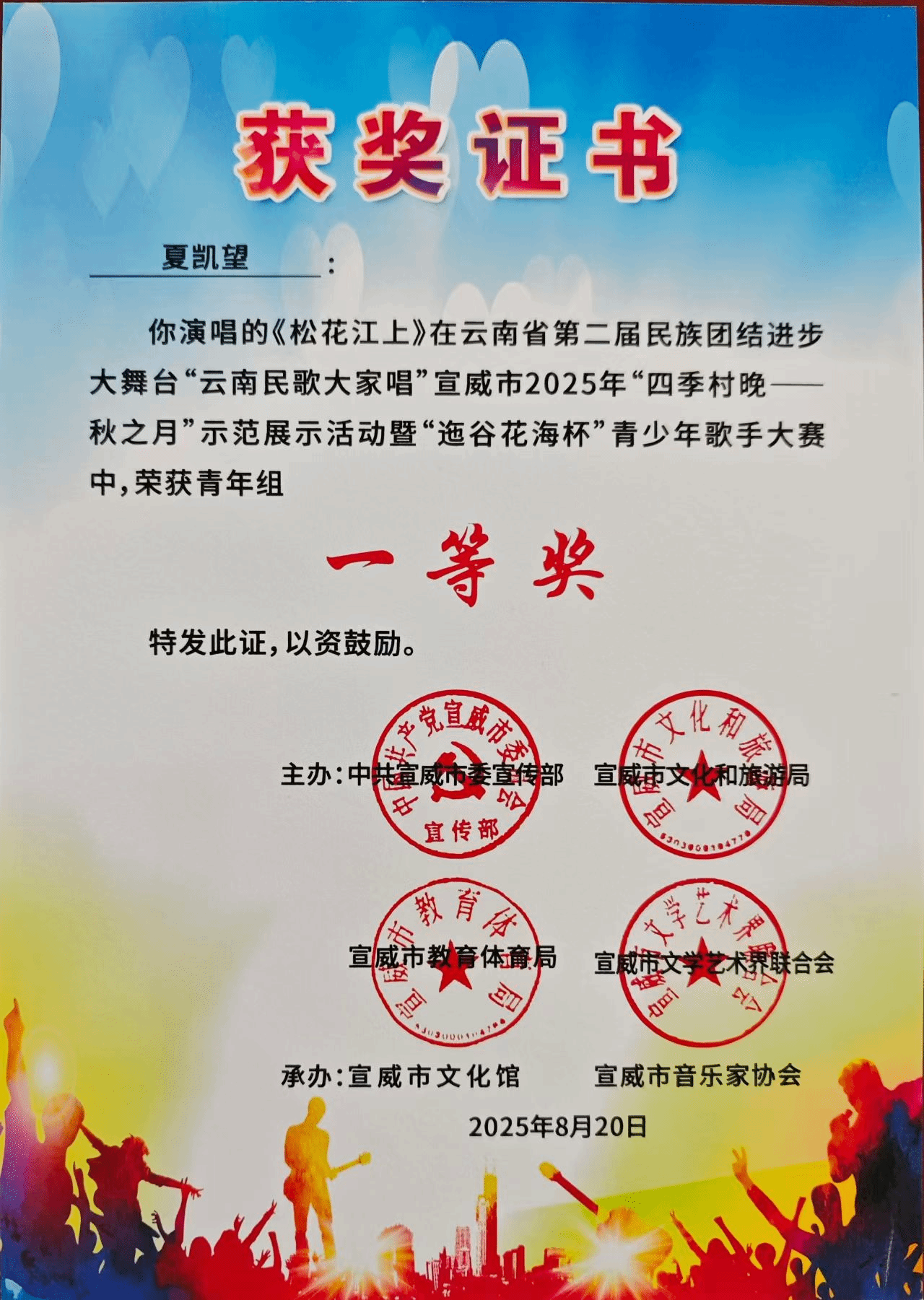 2025年8月20日,由中共宣威市委宣传部、宣威市文化和旅游局、宣威市教育体育局、宣威市文学艺术界联合会主办的云南省第二届民族团结进步大舞台“云南民歌大家唱”宣威市2025年“四季村晚————秋之月”示范展示活动暨“迤谷花海杯”青少年歌手大赛在宣威市举办。金年会jinnianhuicom2023级演唱二班学生夏凯望在大赛中荣获青年组一等奖(指导教师:罗聪鹏)。
